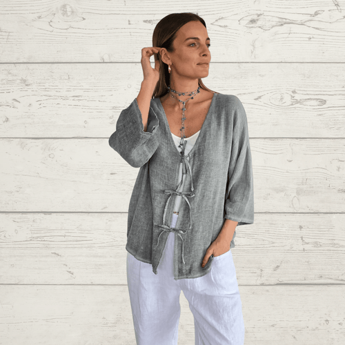 Blusa Gillette 100% Lino Italiano Rayas, fondo Gris