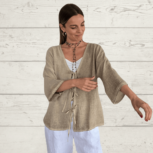 Pantalón 100% Lino Italiano lazo cintura, color Taupe