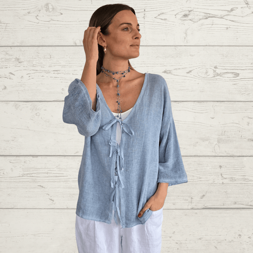Blusa 100% Lino Italiano estampado, fondo Celeste