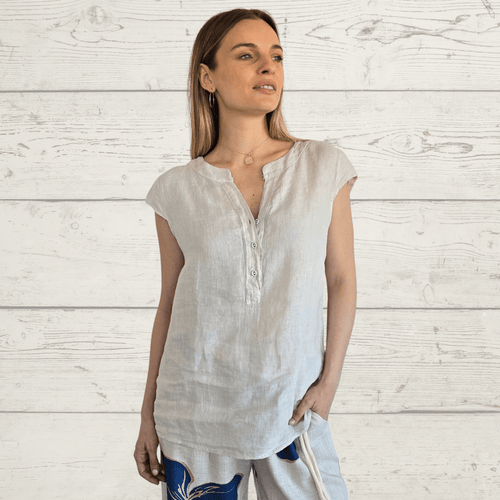 Blusa de lino Italiano sin mangas, color celeste jeans