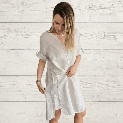Vestido Italiano de lino con pasamanería, color beige