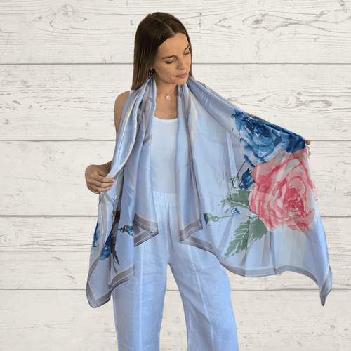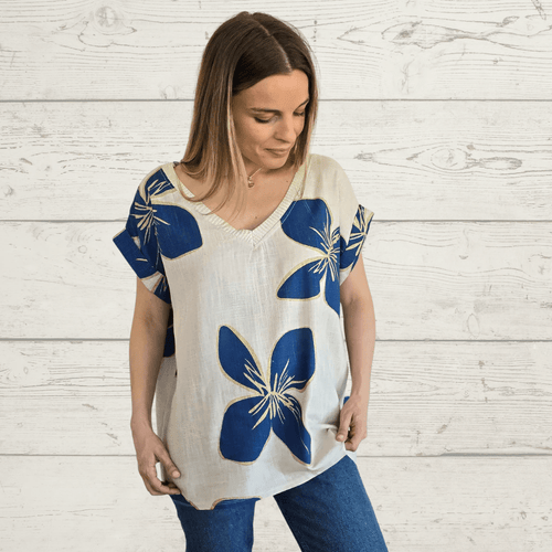 Blusa Italiana estampada escote en V, fondo Beige con Azul