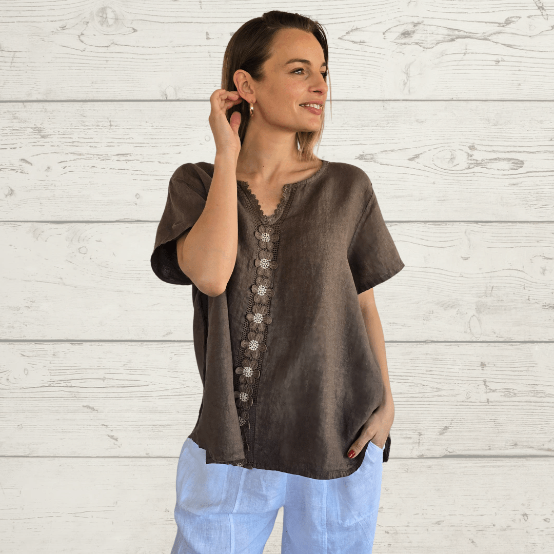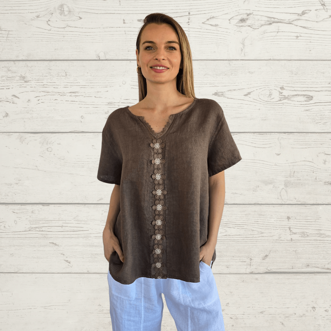 Blusa italiana 100% lino, con bordado, manga corta, escote en V, color chocolate
