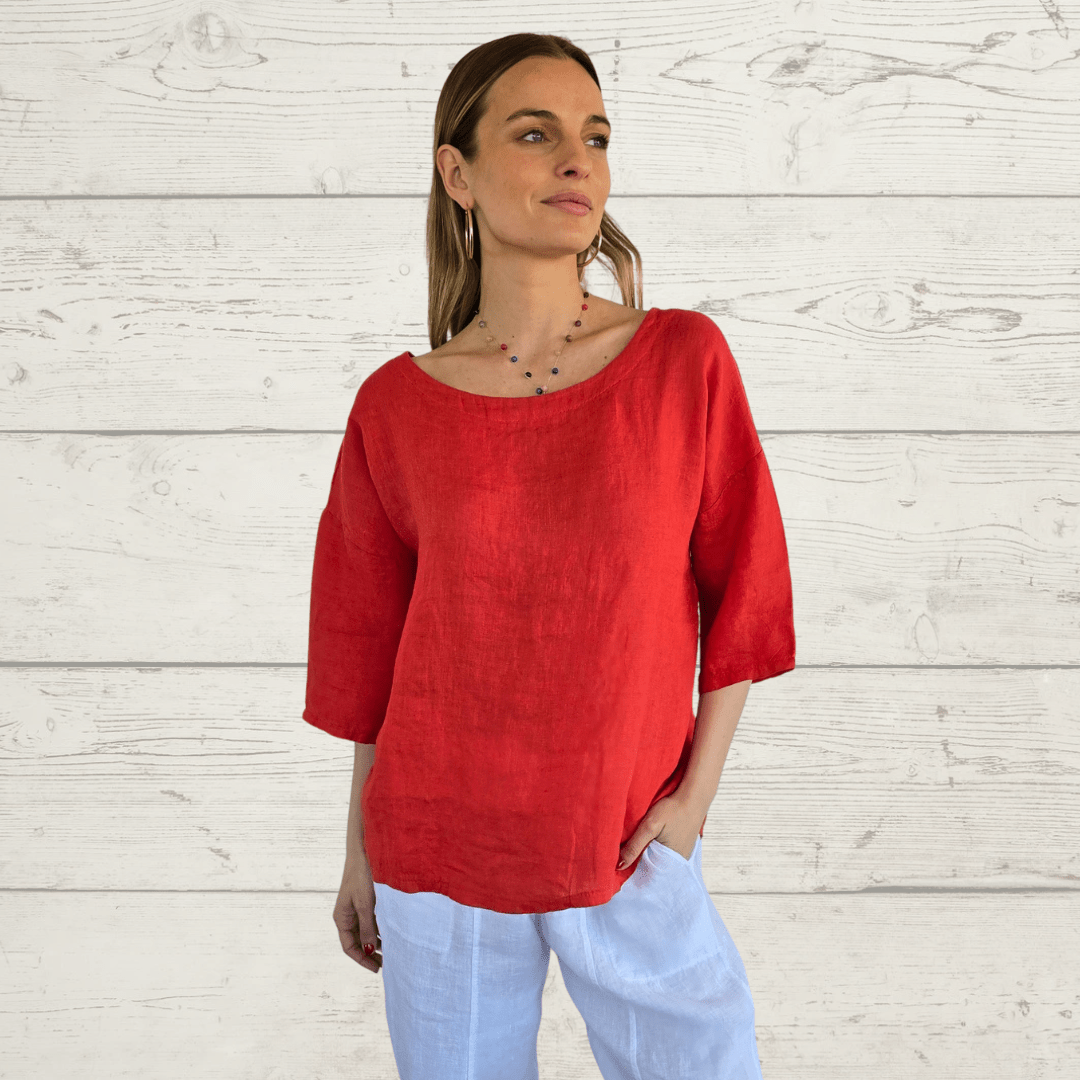 Blusa italiana de lino Italiano, cuello redondo, manga 3/4, color rojo