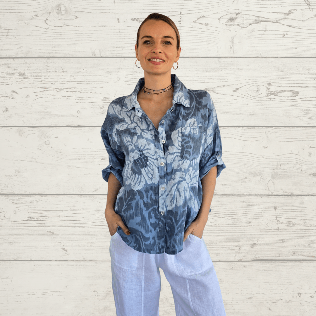Blusa 100% Lino Italiano estampada, manga corta, fondo celeste