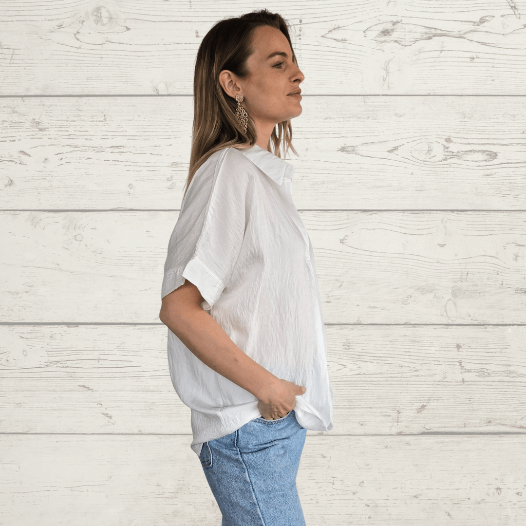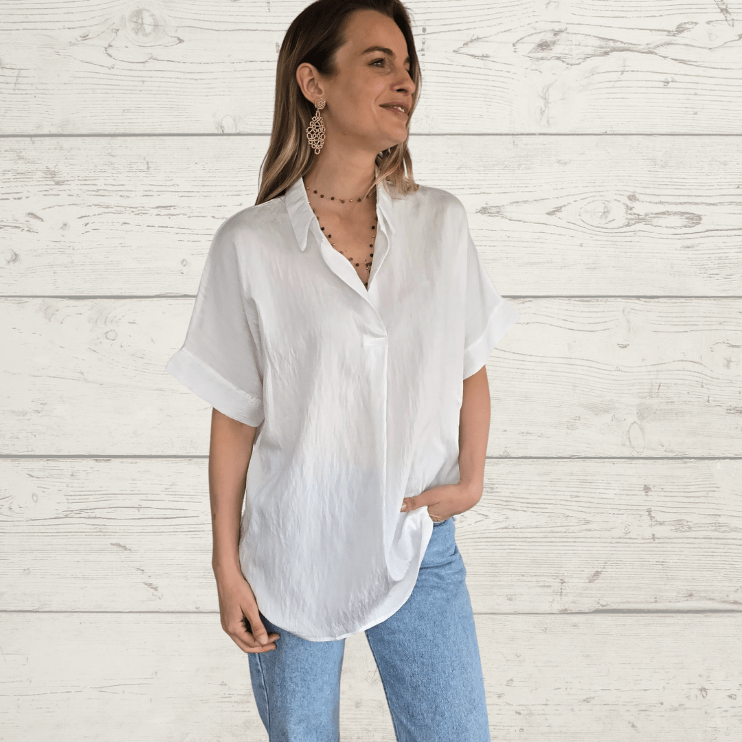 Blusa básica , escote en V, manga corta, de poliviscosa, color blanco