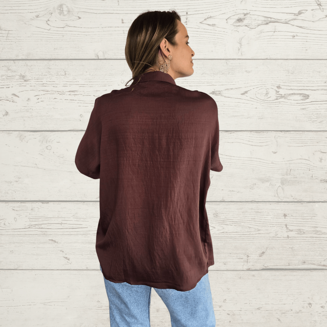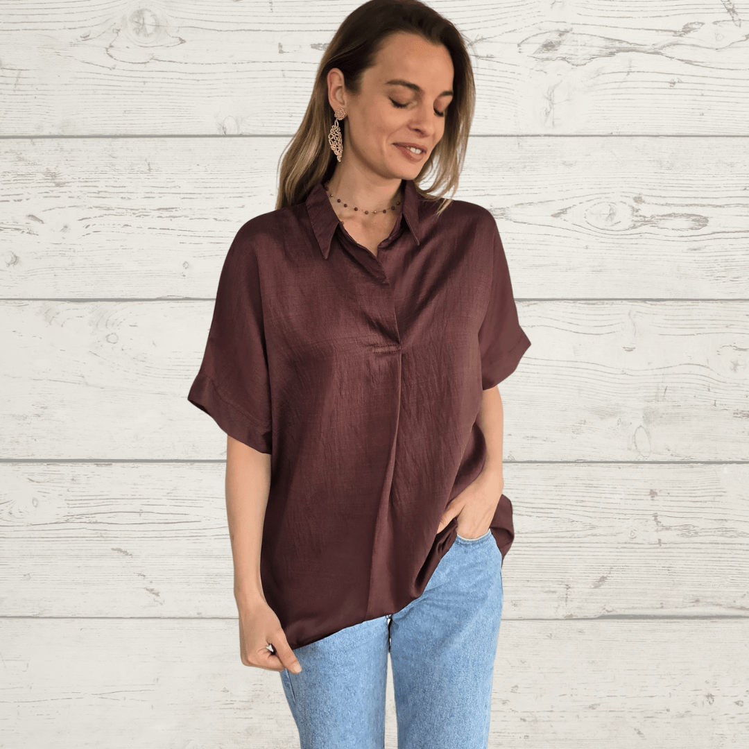 Blusa básica , escote en V, manga corta, de poliviscosa, color chocolate