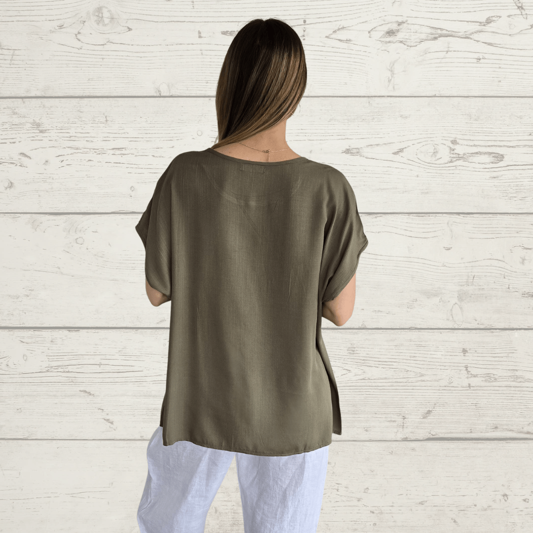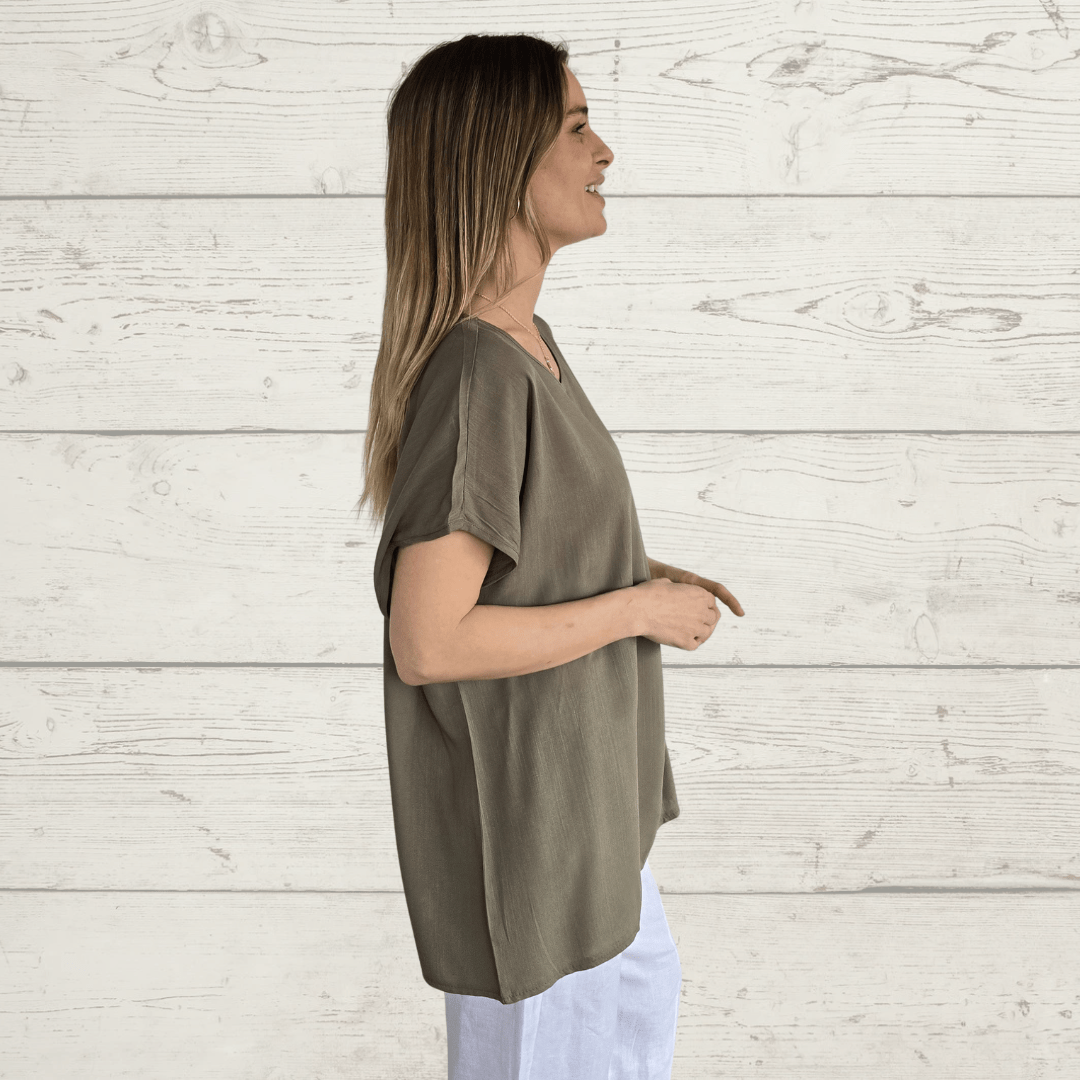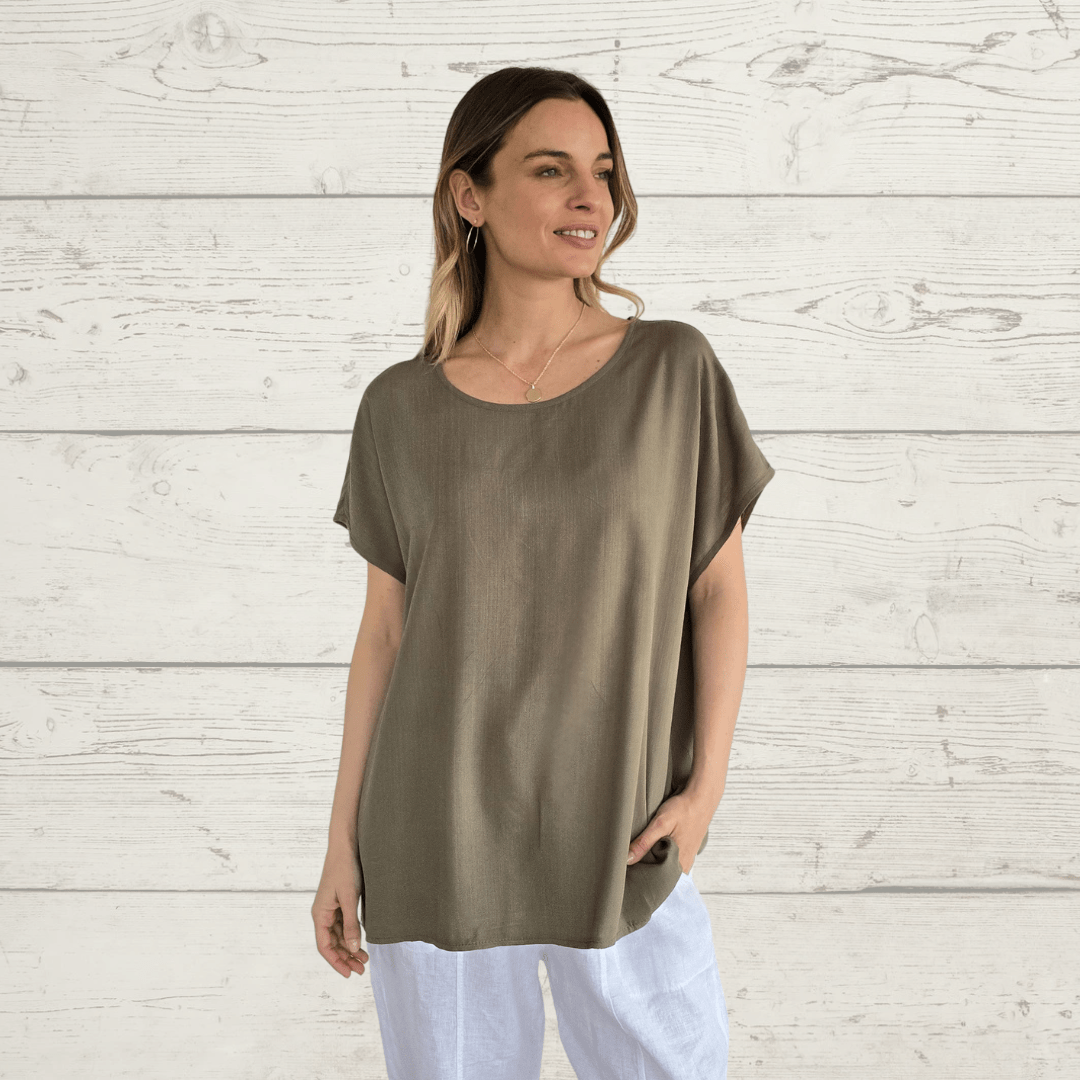 Blusa básica ancha, cuello redondo, manga corta, de algodón con viscosa, color verde