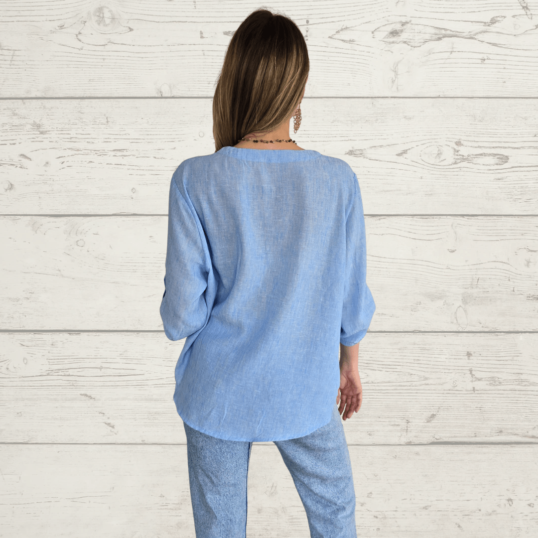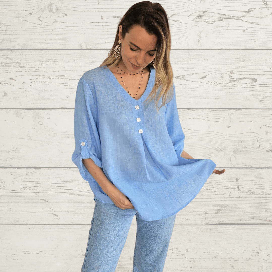 Blusa con tres botones en el escote, escote en V, manga 3/4, de algodón, color celeste