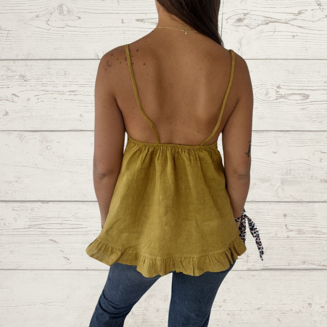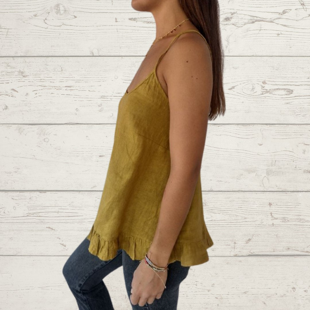 Blusa 100% Lino Italiano de tiritas, con vuelos en la basta, color pistacho