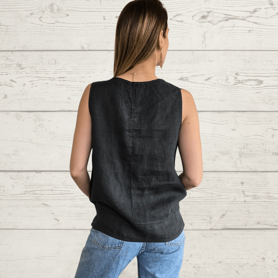 Blusa 100% lino Italiano, con botones de concha de perla, cuello redondo, sin mangas, color gris