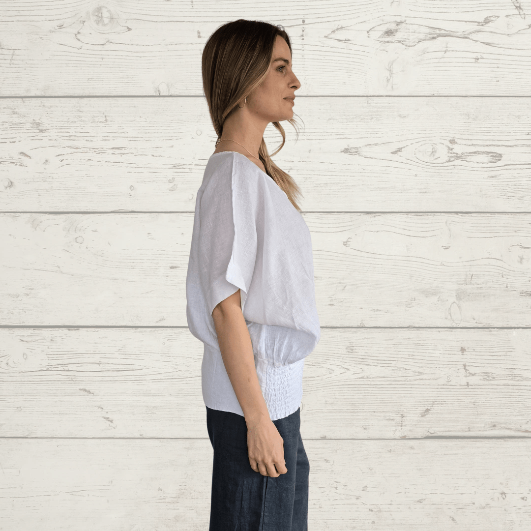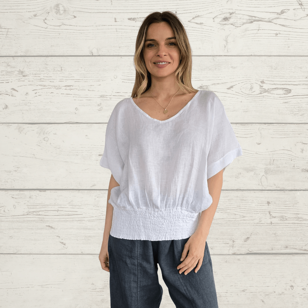 Blusa 100% Lino Italiano, pretina con elástico, escote en V, manga corta, color blanco
