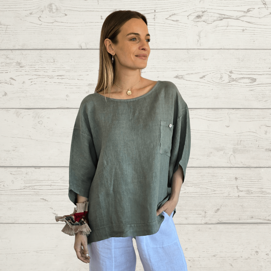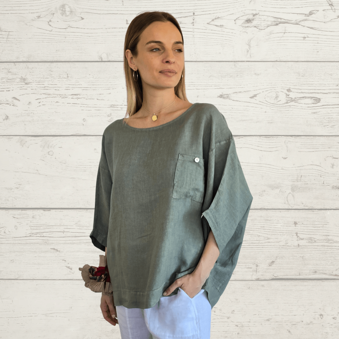 Blusa 100% lino Italiano, con un bolsillo con botón, cuello redondo, color verde