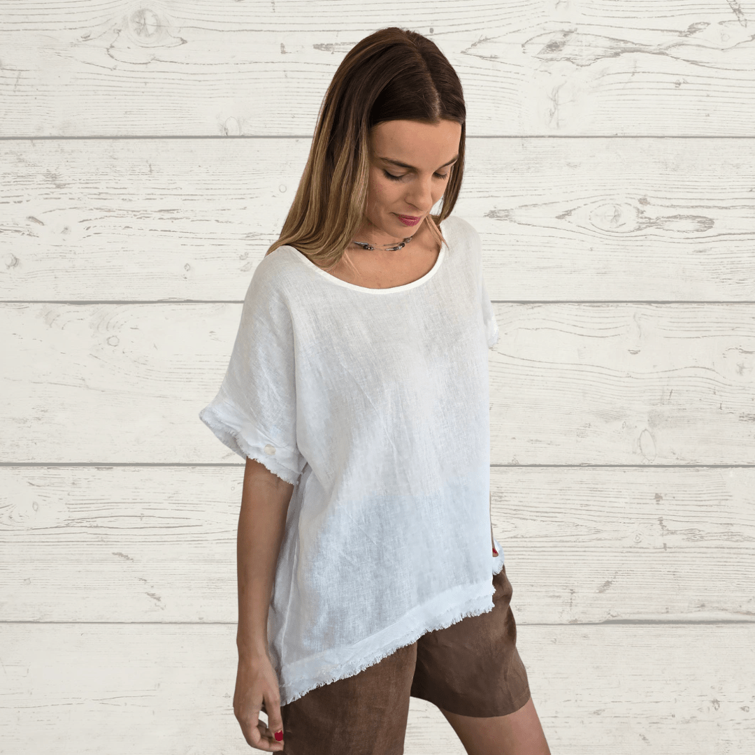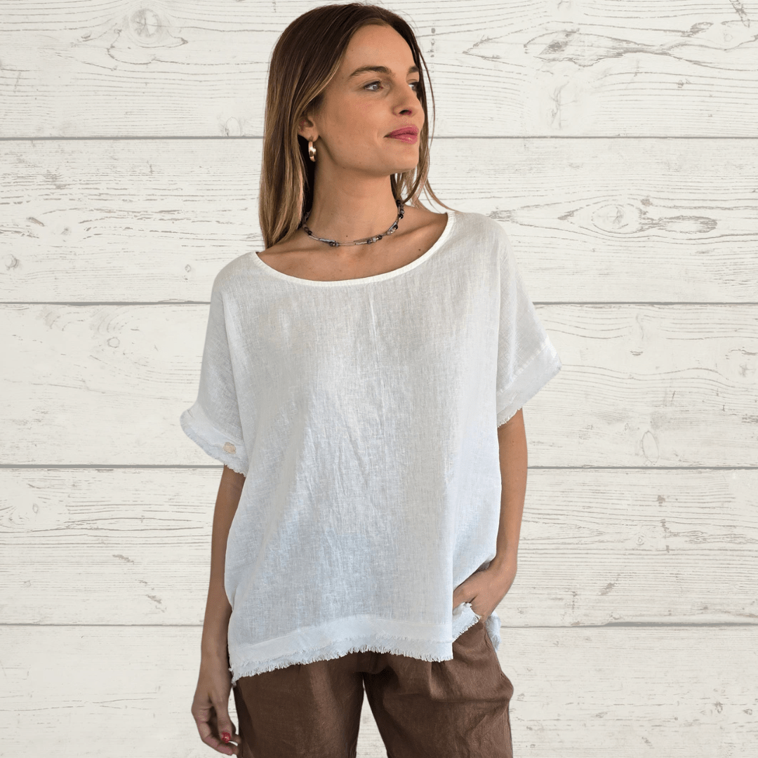 Blusa Bolonia italiana, desflecada en las mangas y basta, cuello redondo, manga corta, de algodón muy suave, color Blanco