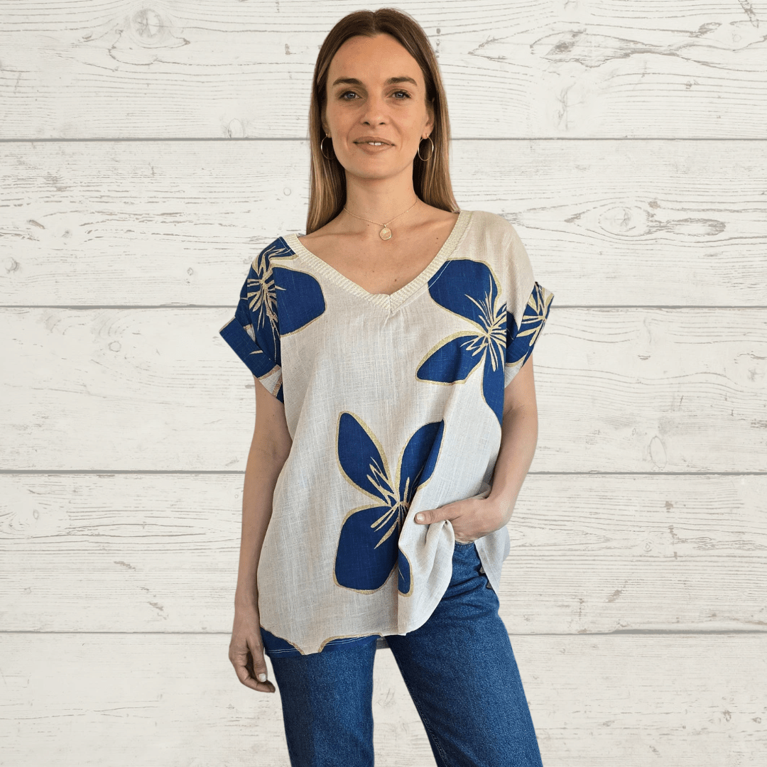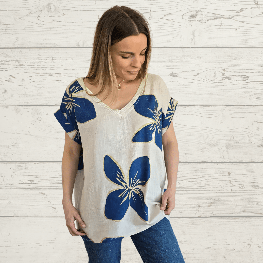 Blusa italiana estampada, de lino con viscosa, escote en V, manga corta, fondo beige con azul
