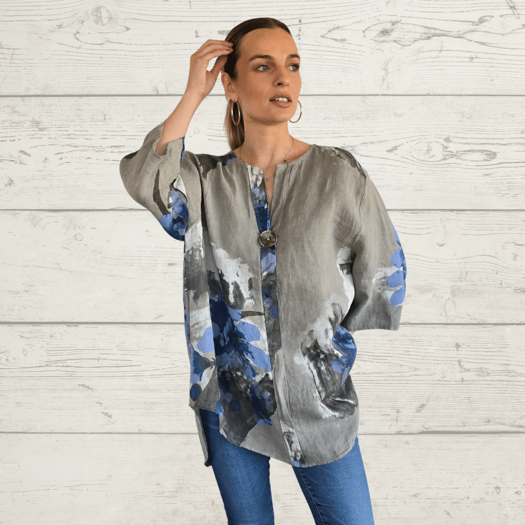 Blusa italiana 100% lino estampado, con un botón, manga 3/4, fondo taupe