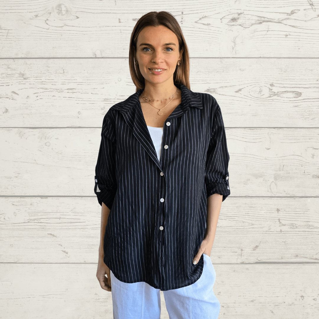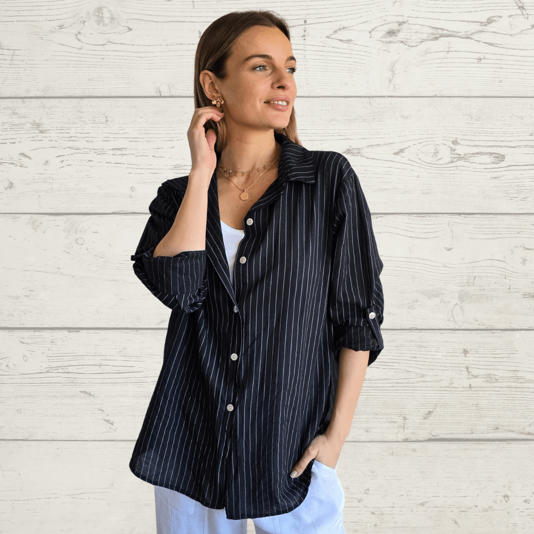 Blusa Italiana rayada de algodón, manga larga, abotonada, color negro con gris