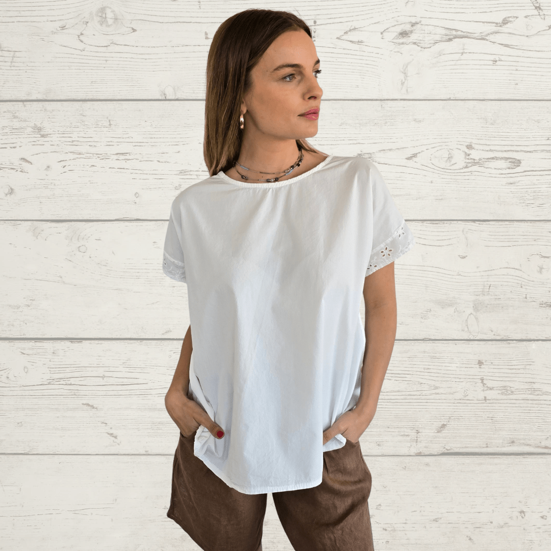 Blusa Roma italiana de algodón muy suave con detalles bordados en la manga y la espalda, cuello redondo, color Blanco