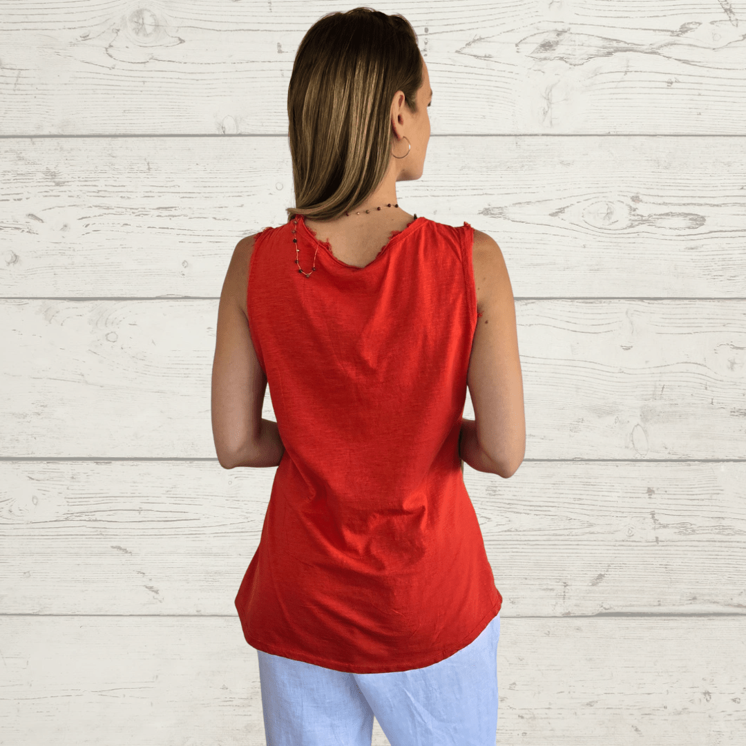 Blusa Italiana de lino con la espalda de algodón, desflecada en el cuello y manga, escote en V, color rojo