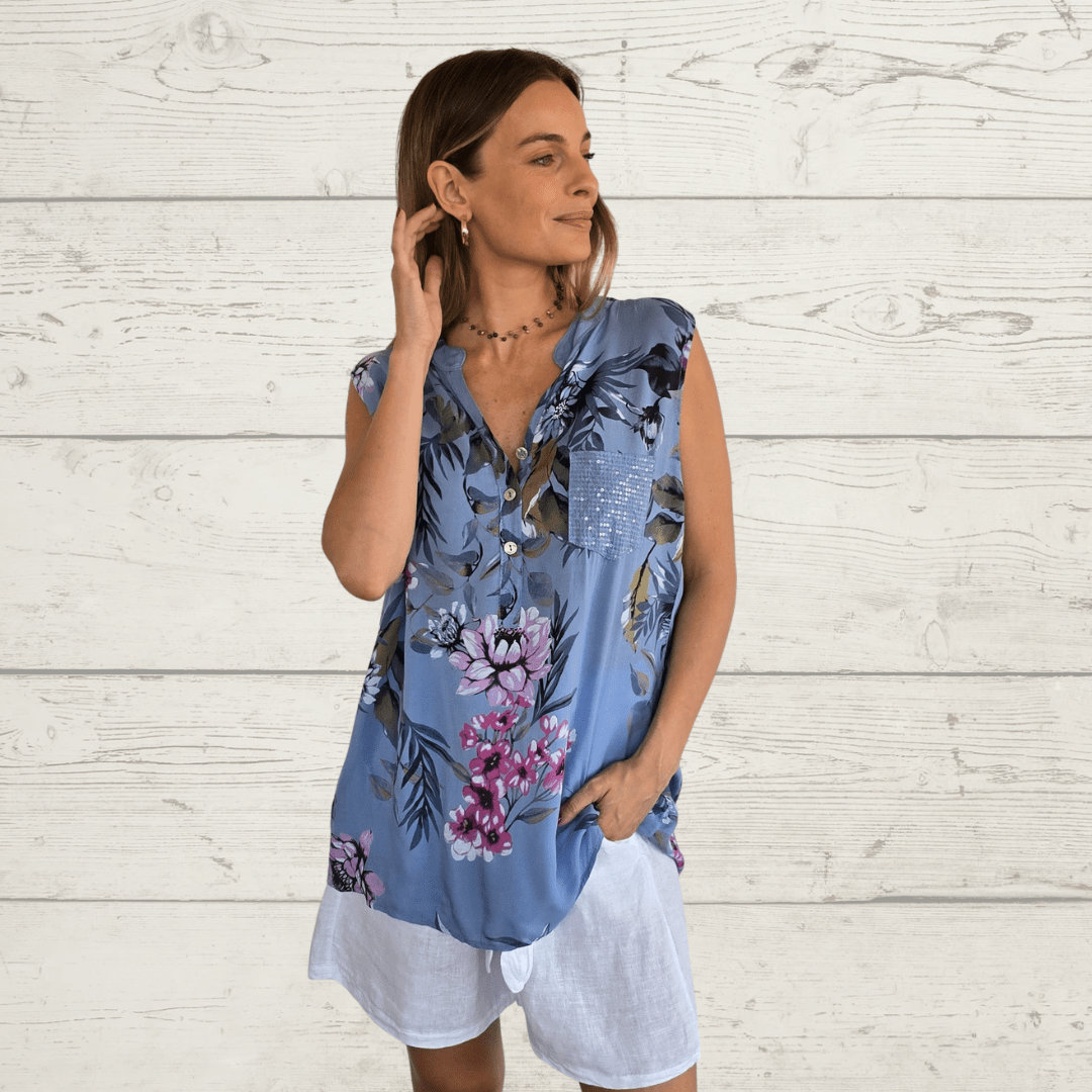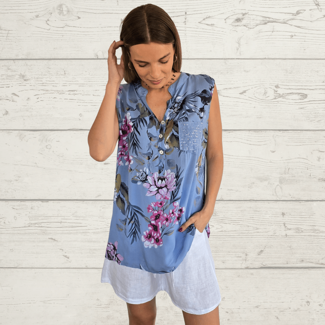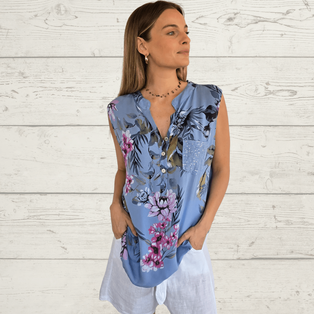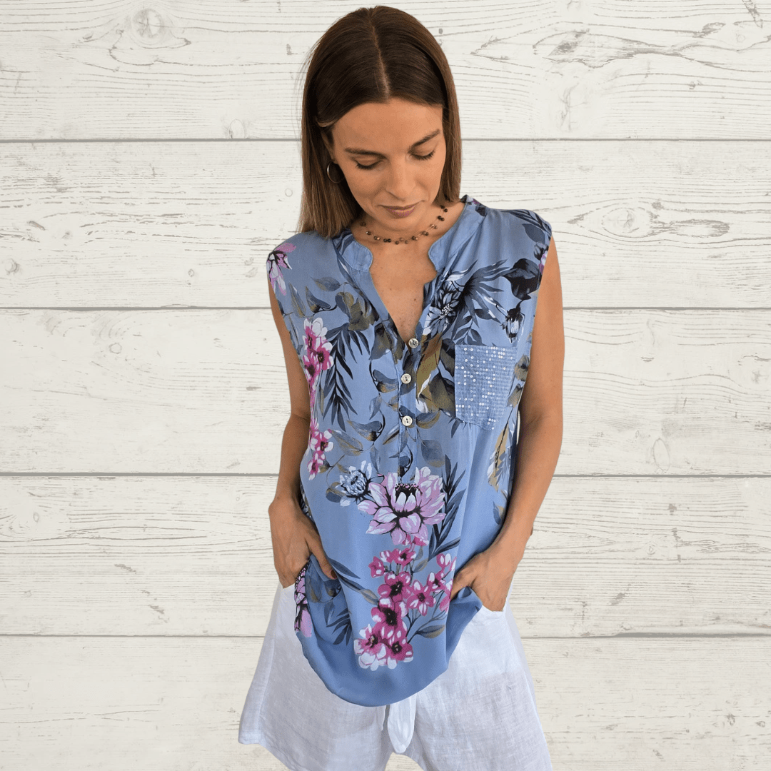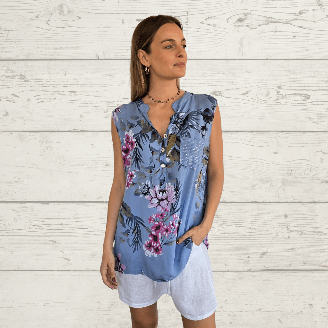 Blusa italiana de viscosa estampada, sin mangas, fondo celeste