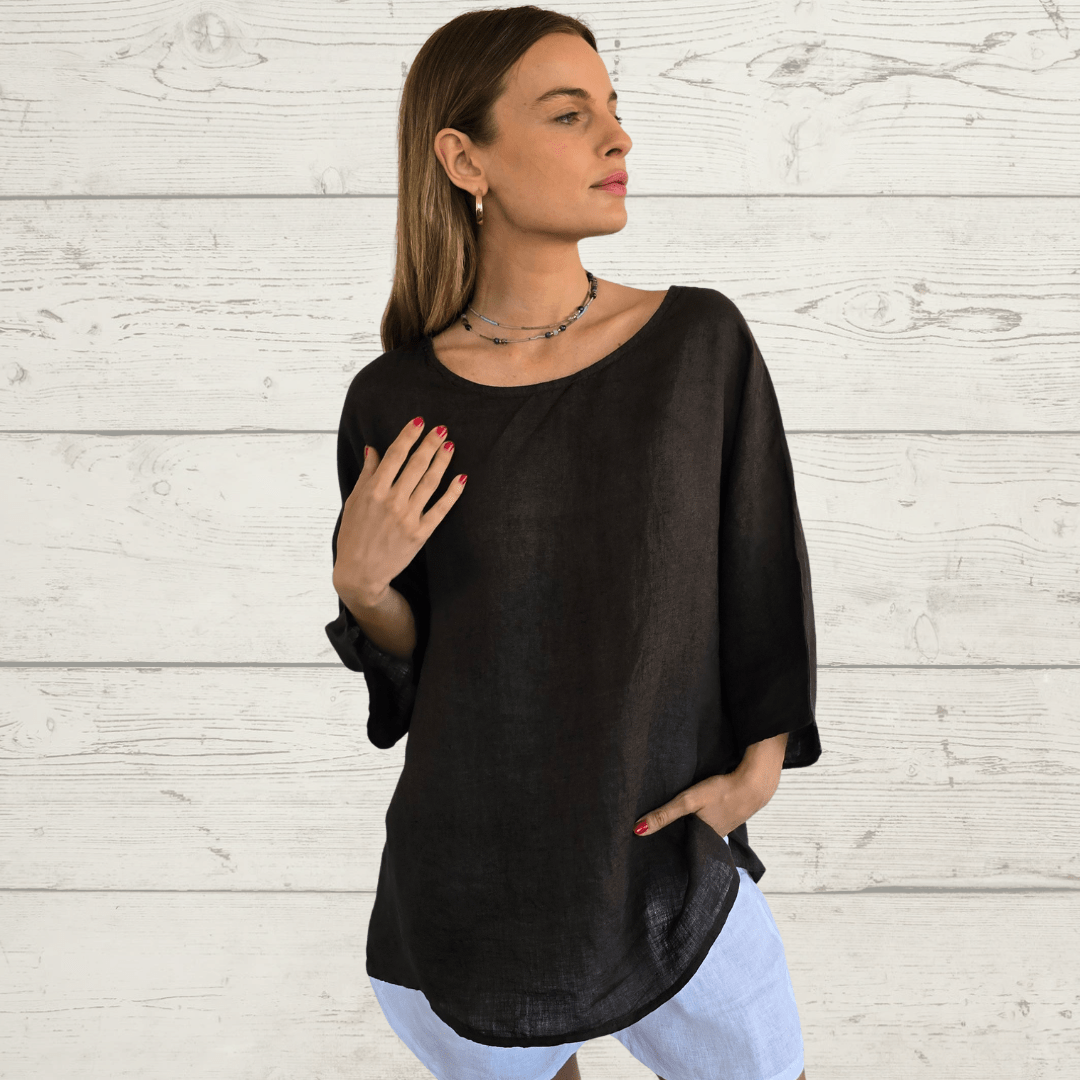 Blusa italiana de lino Italiano, cuello redondo, manga 3/4, color chocolate