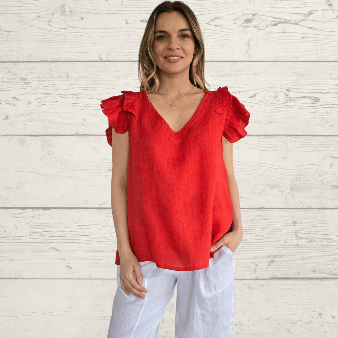 Blusa 100% Lino Italiano, mangas irregulares con vuelos, escote en V, color rojo tomate