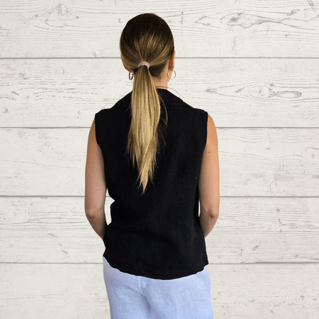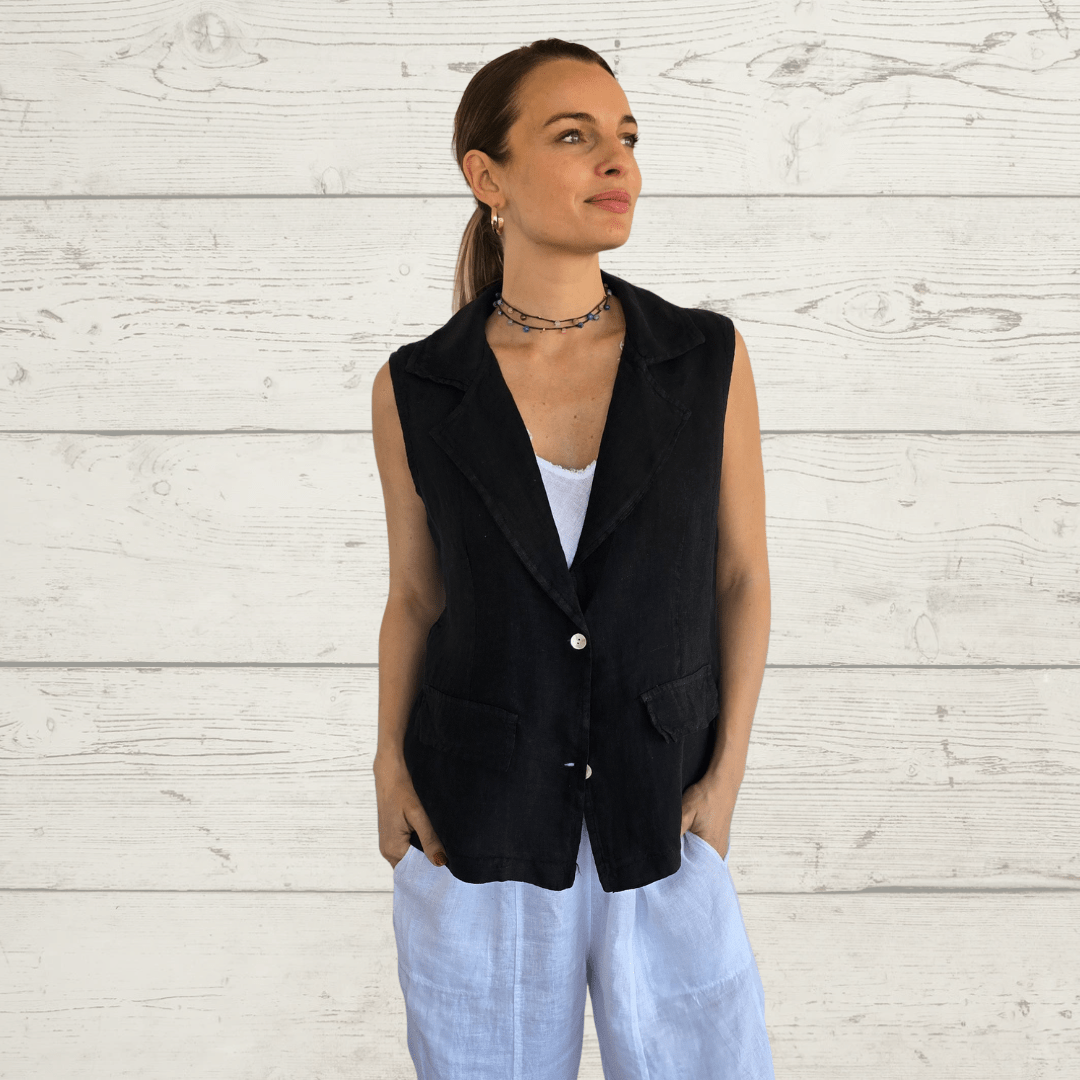 Blazer 100% lino Italiano, sin mangas, con dos botones, color negro