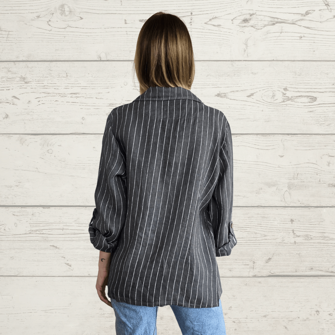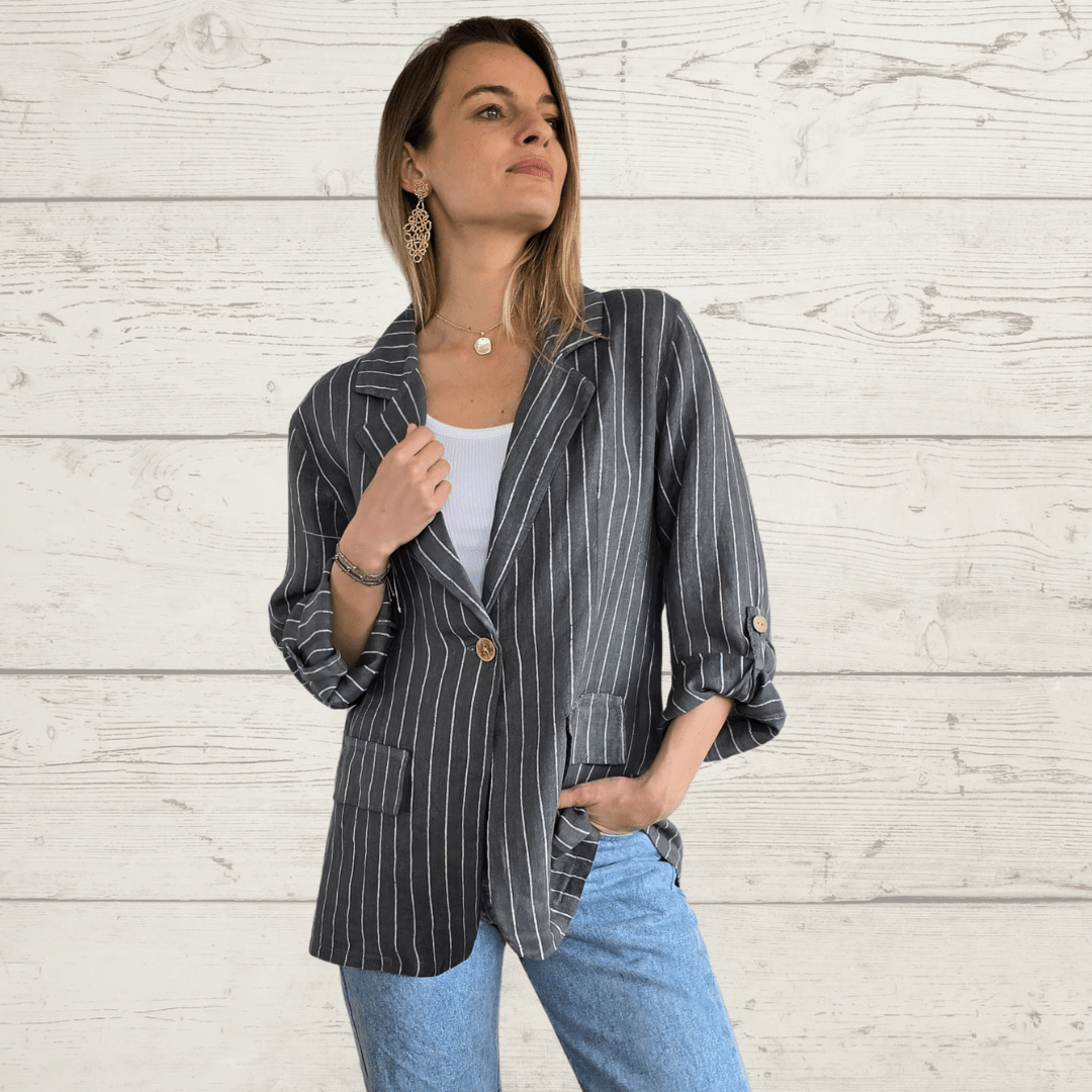 Blazer Italiano 100% Lino Italiano rayado, un botón, manga larga, fondo gris con blanco