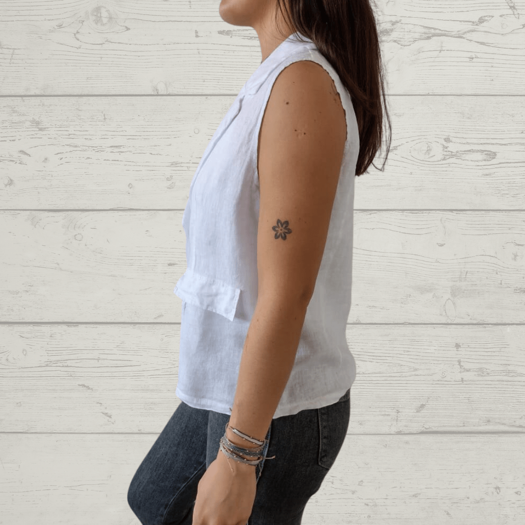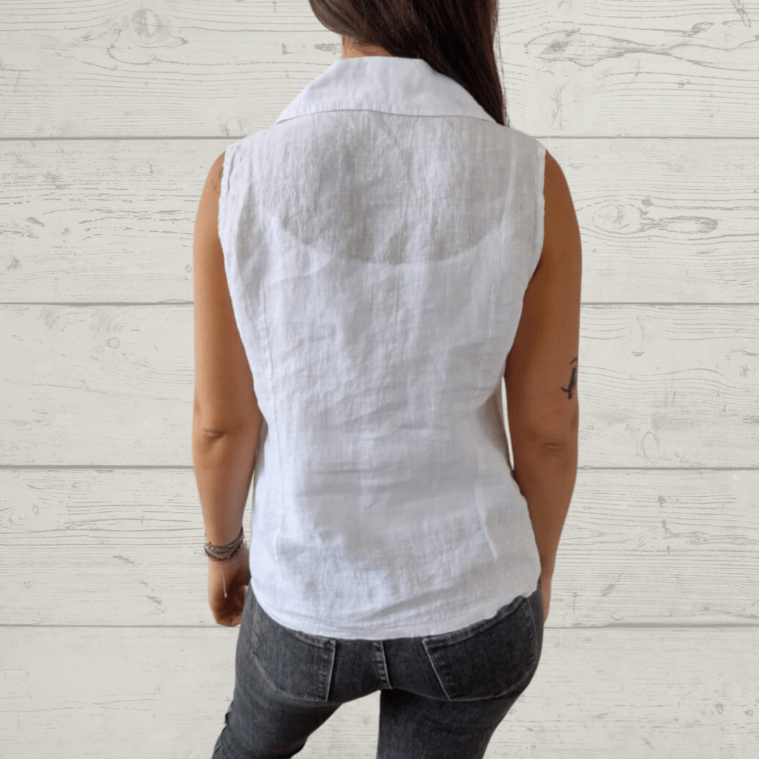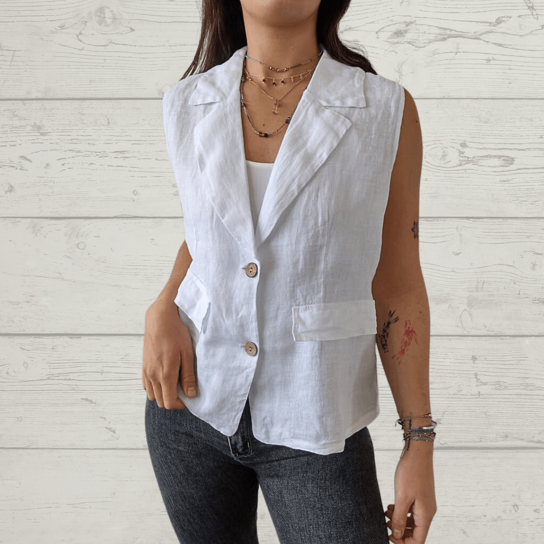 Chaqueta italiana 100% lino, tipo blazer sin mangas, con dos botones, color blanco