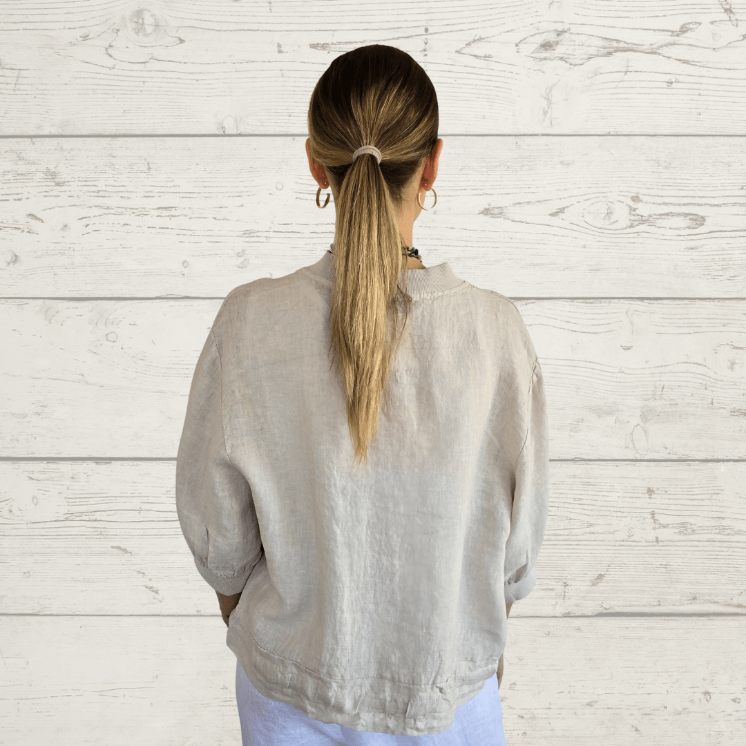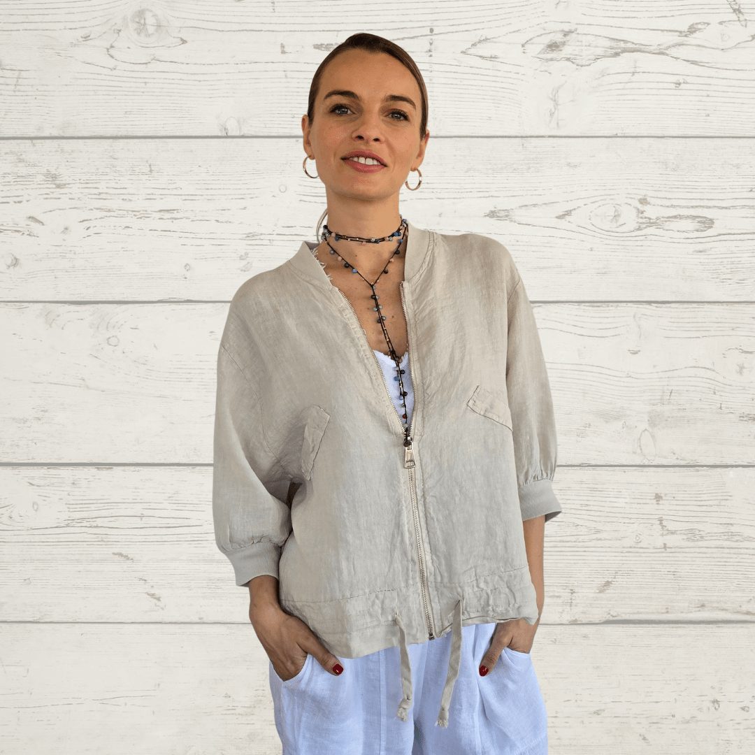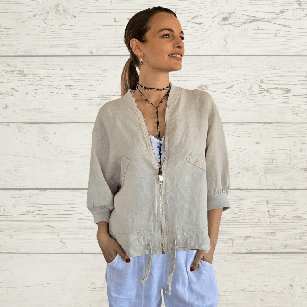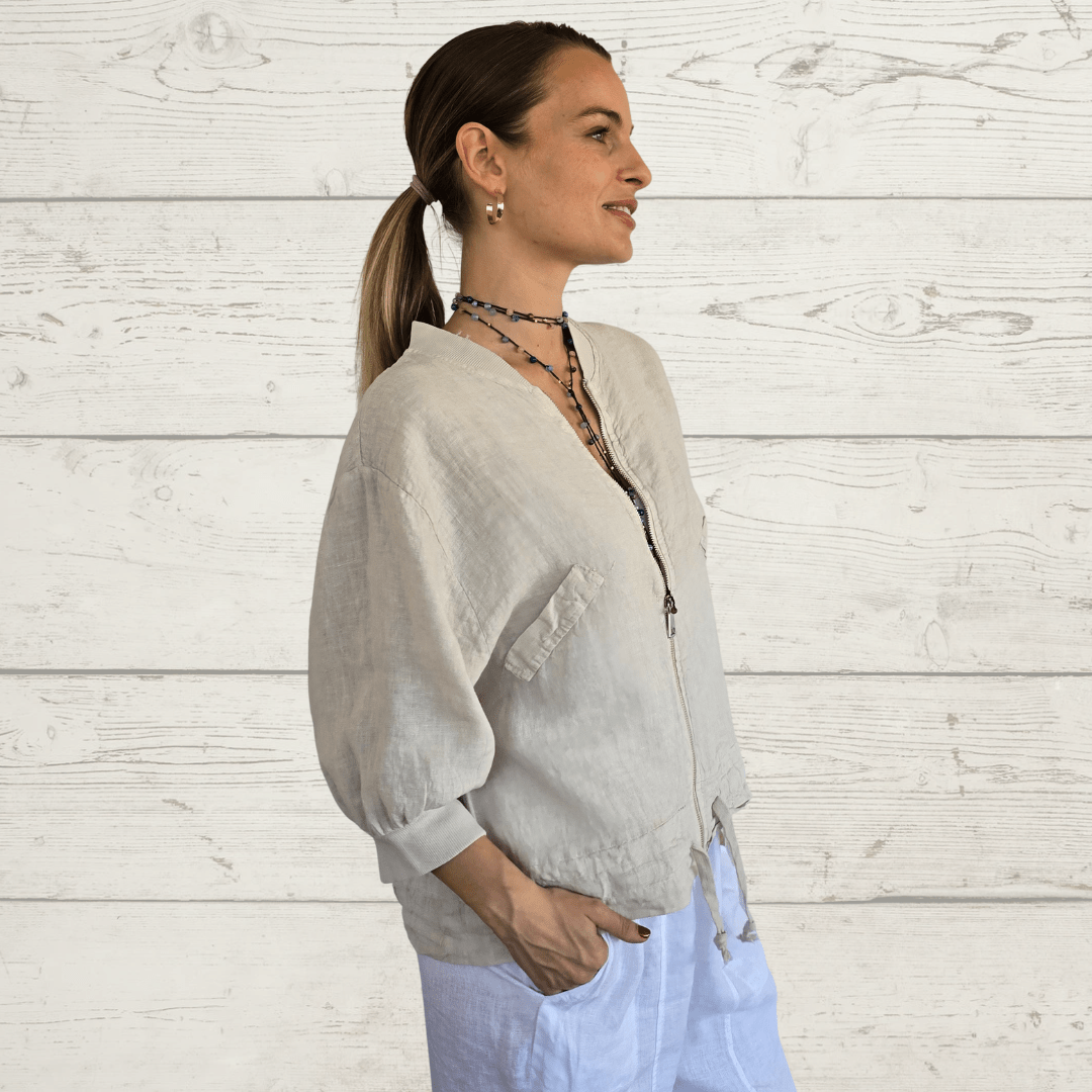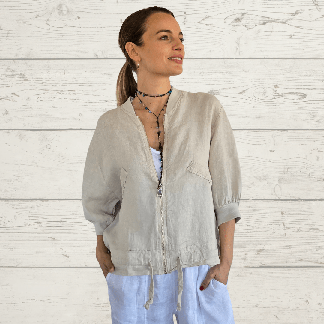 Bomber italiana 100% lino , con tapa de bolsillo, manga 3/4 y cordón en la pretina, color beige