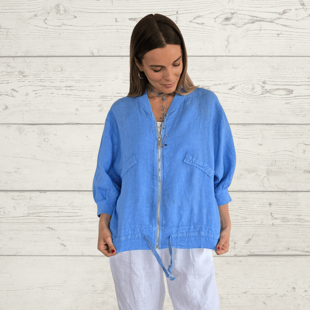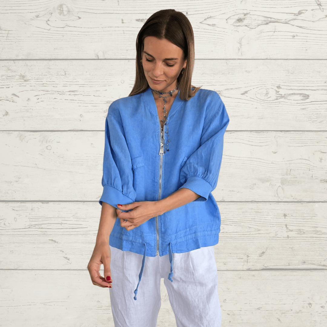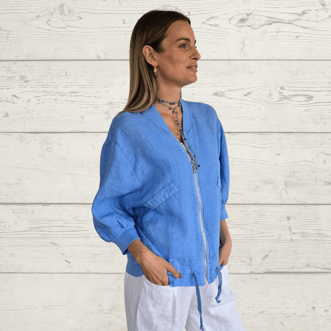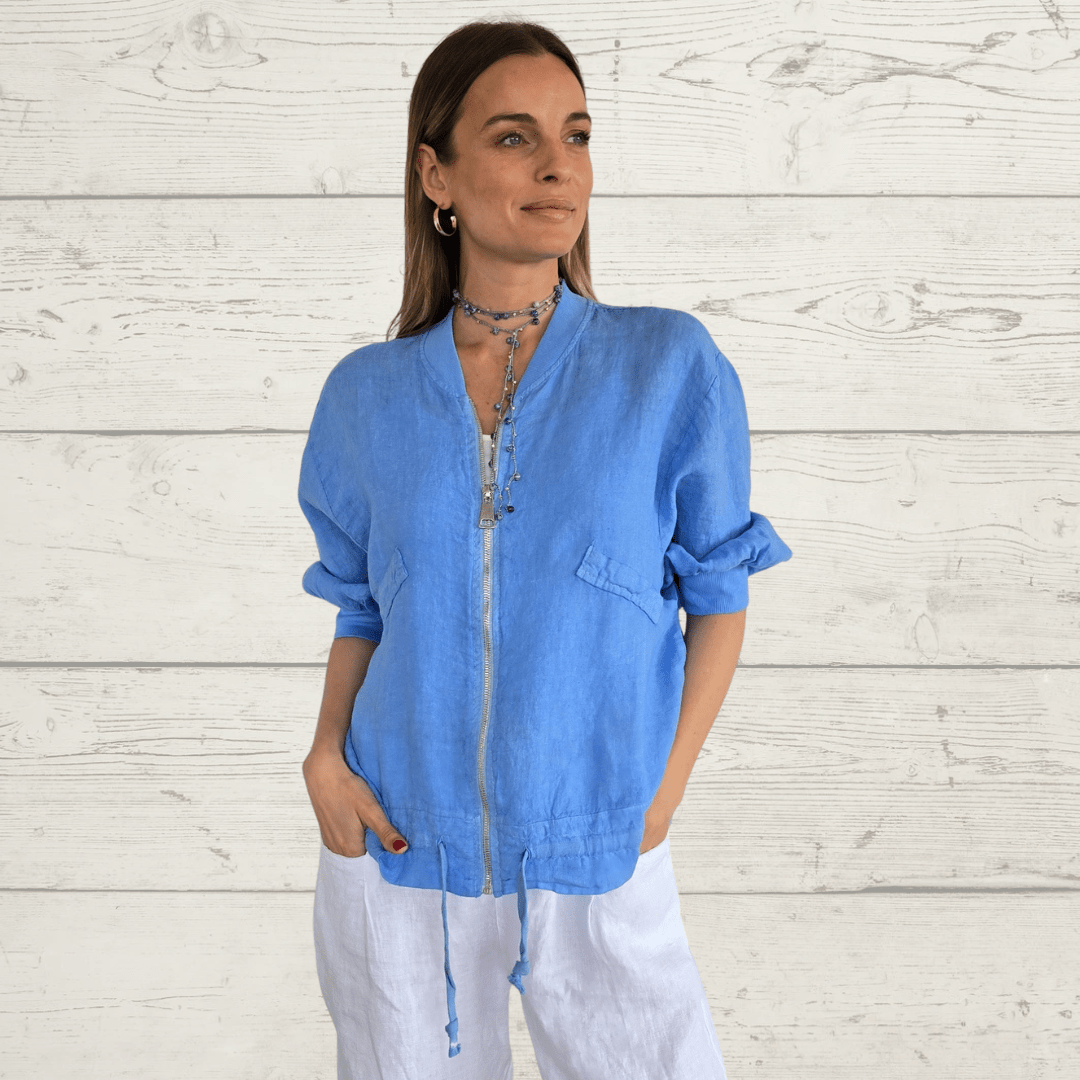Bomber italiana 100% lino , con tapa de bolsillo, manga 3/4 y cordón en la pretina, color jacinto
