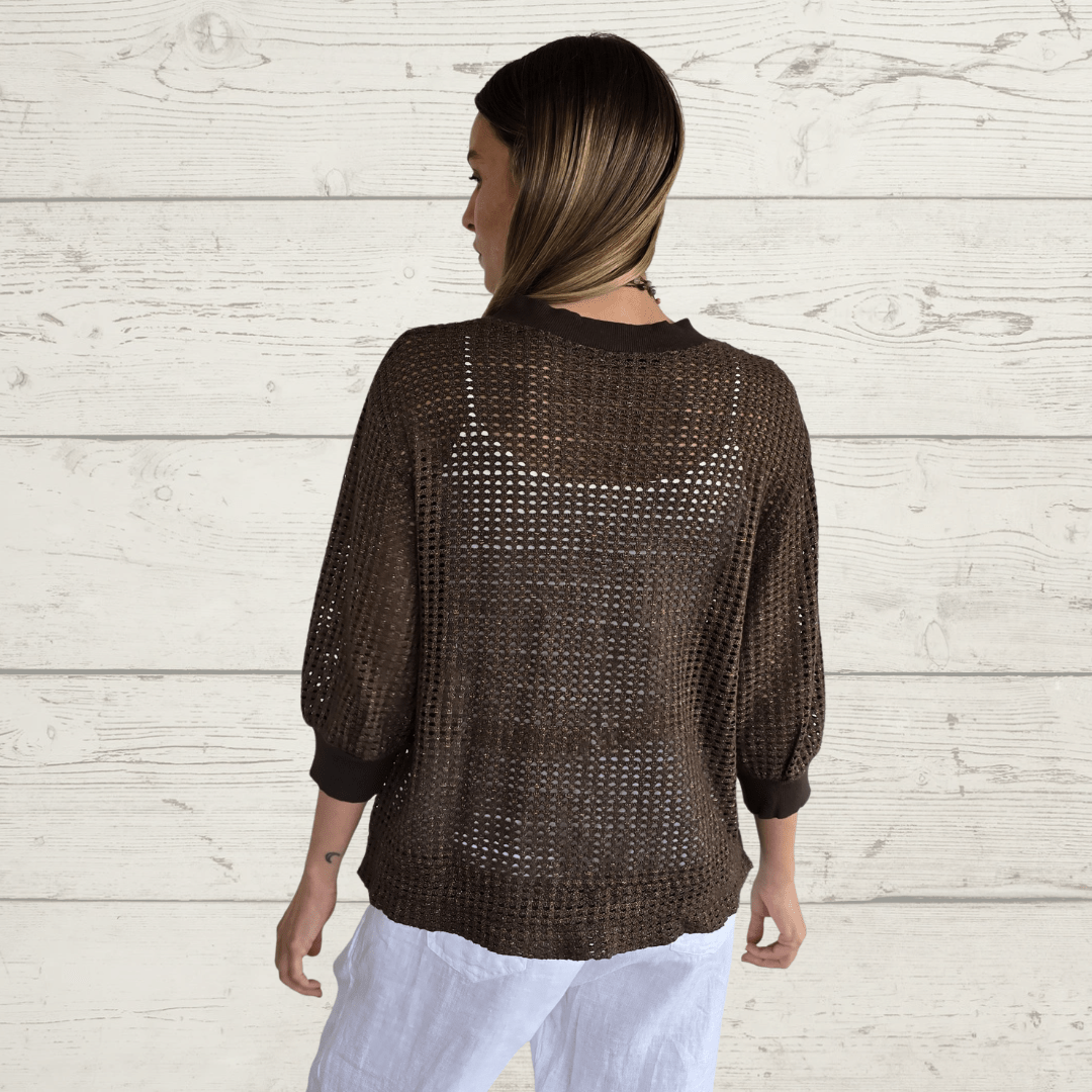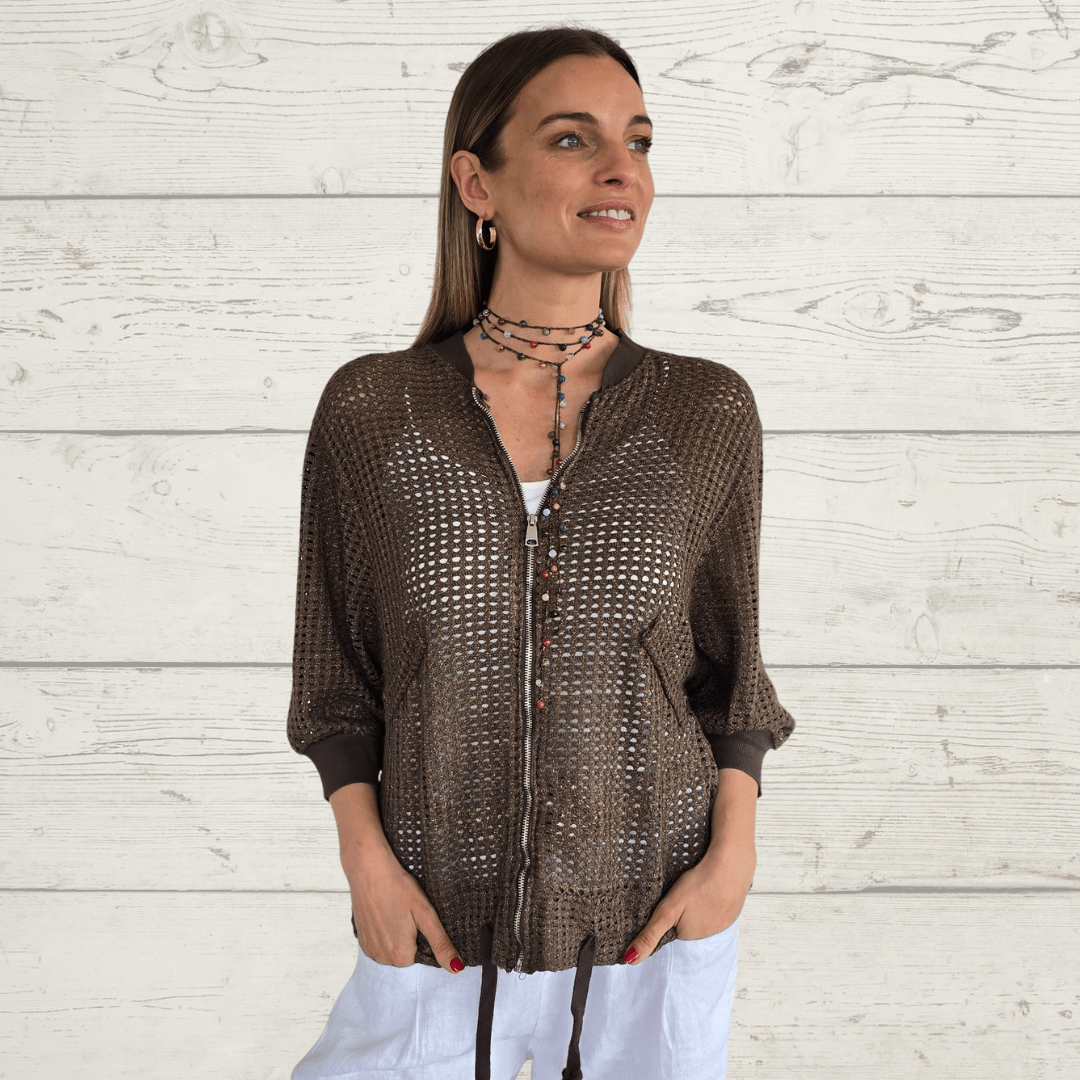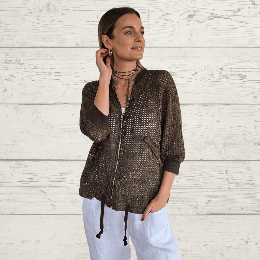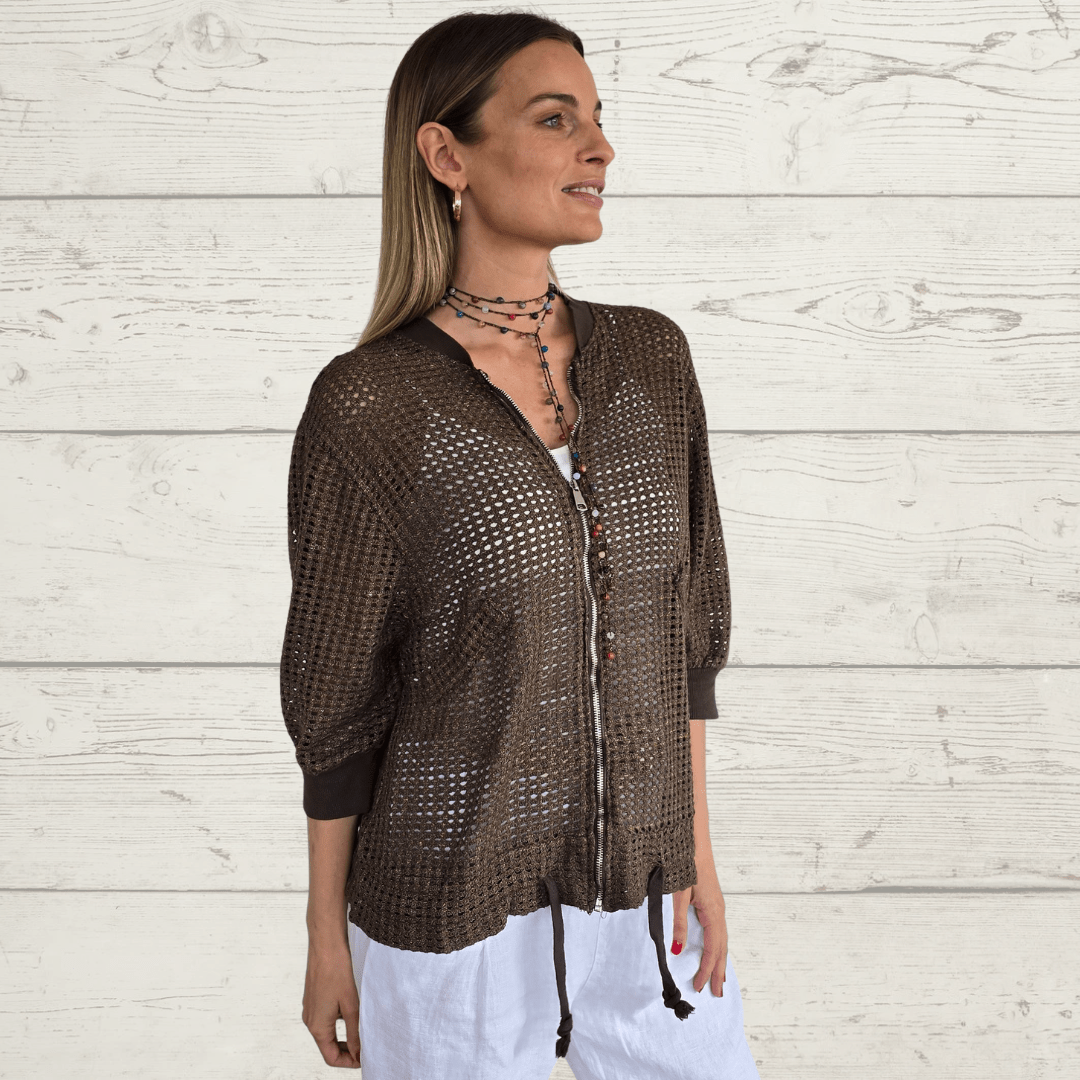 Bomber italiana 100% algodón tejido tipo crochet, con tapa de bolsillo, manga 3/4 y cordón en la pretina, color chocolate