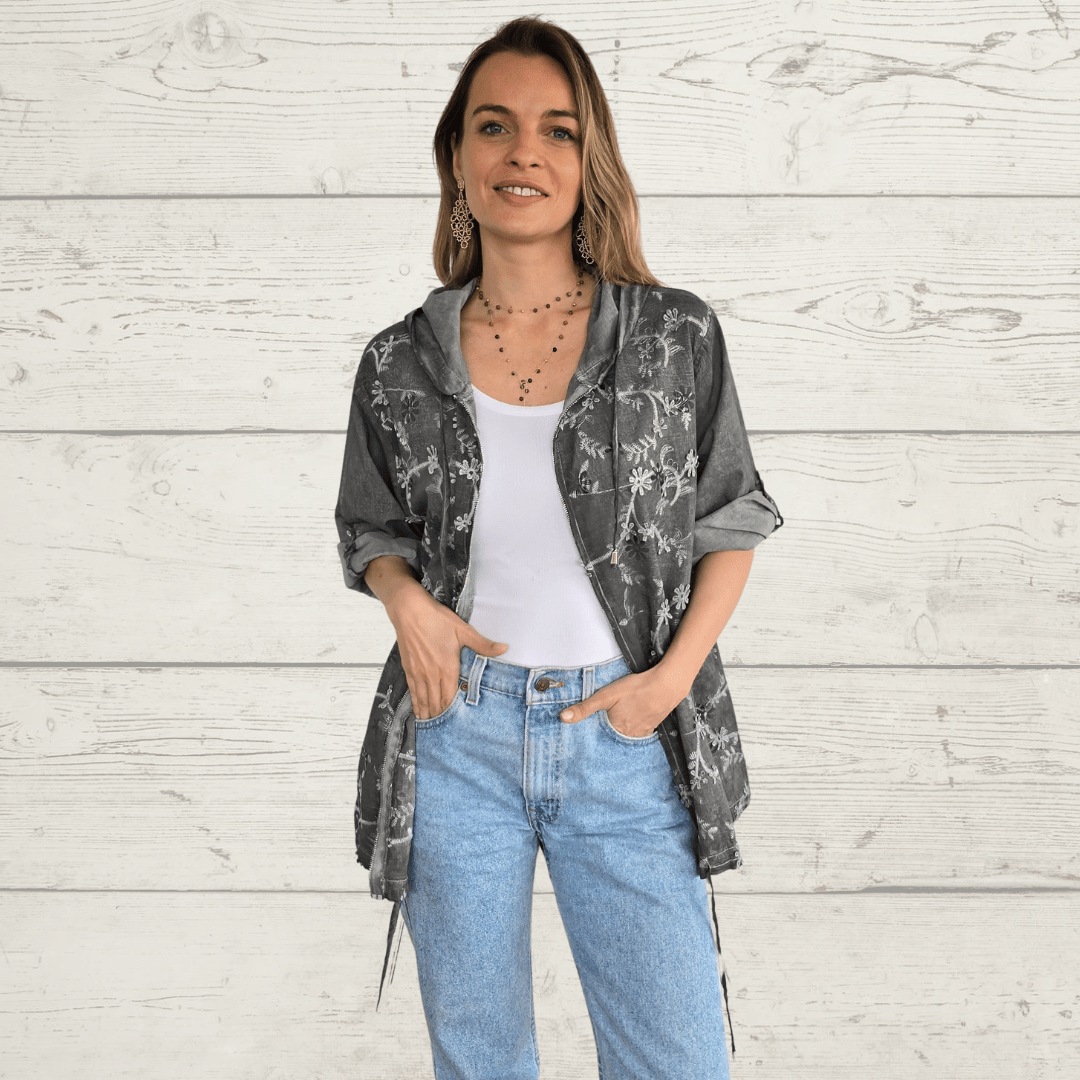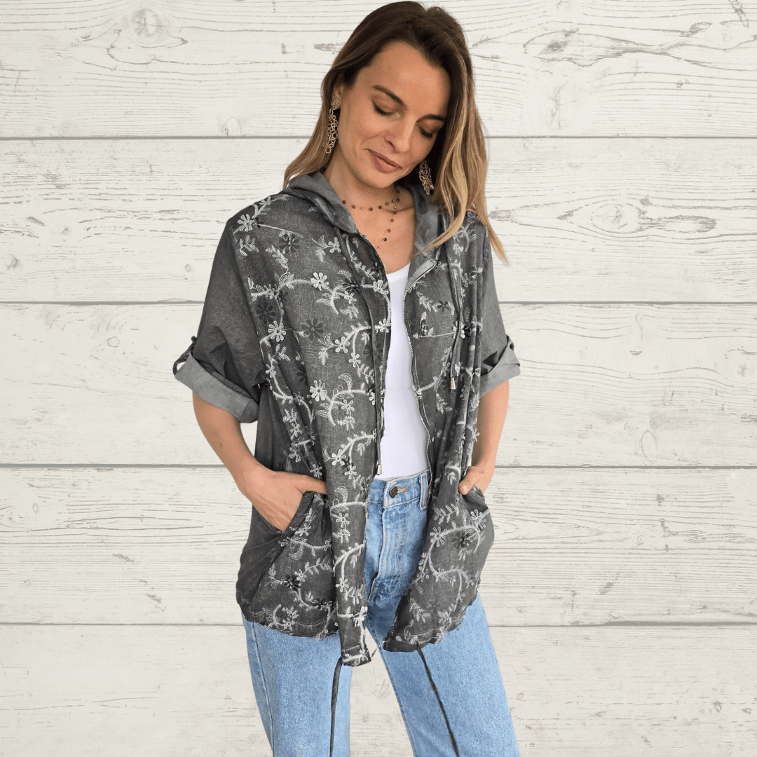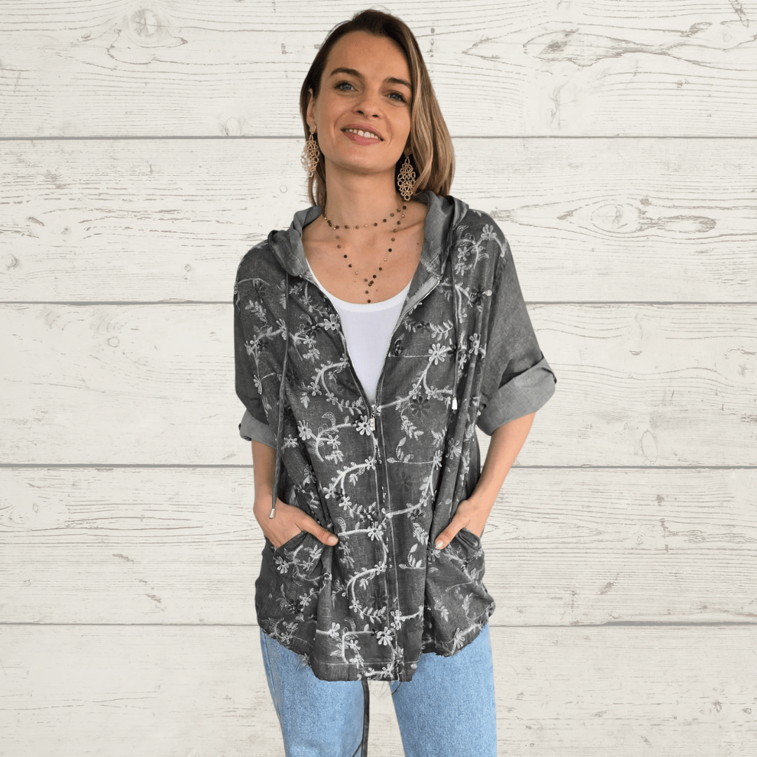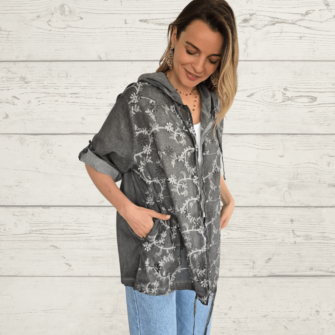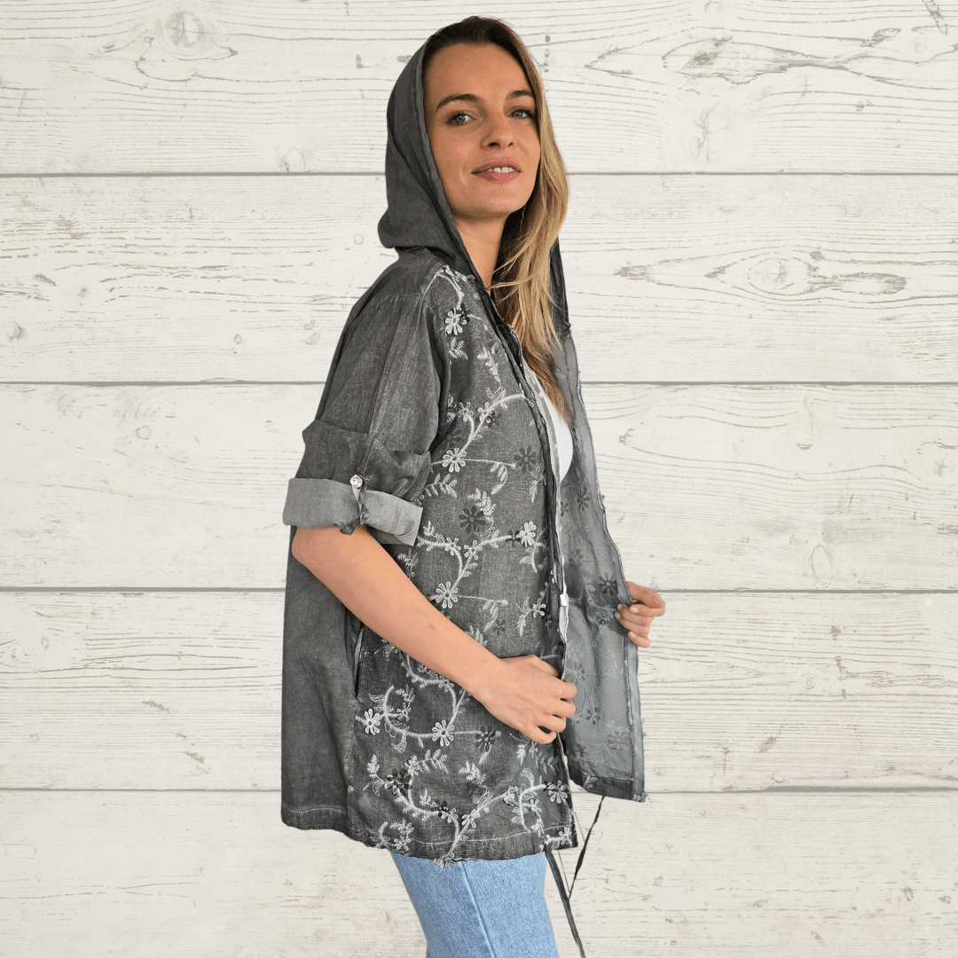 Chaqueta bordada de algodón delgado , con gorro y cierre, manga 3/4, con bolsillos a los lados, color gris