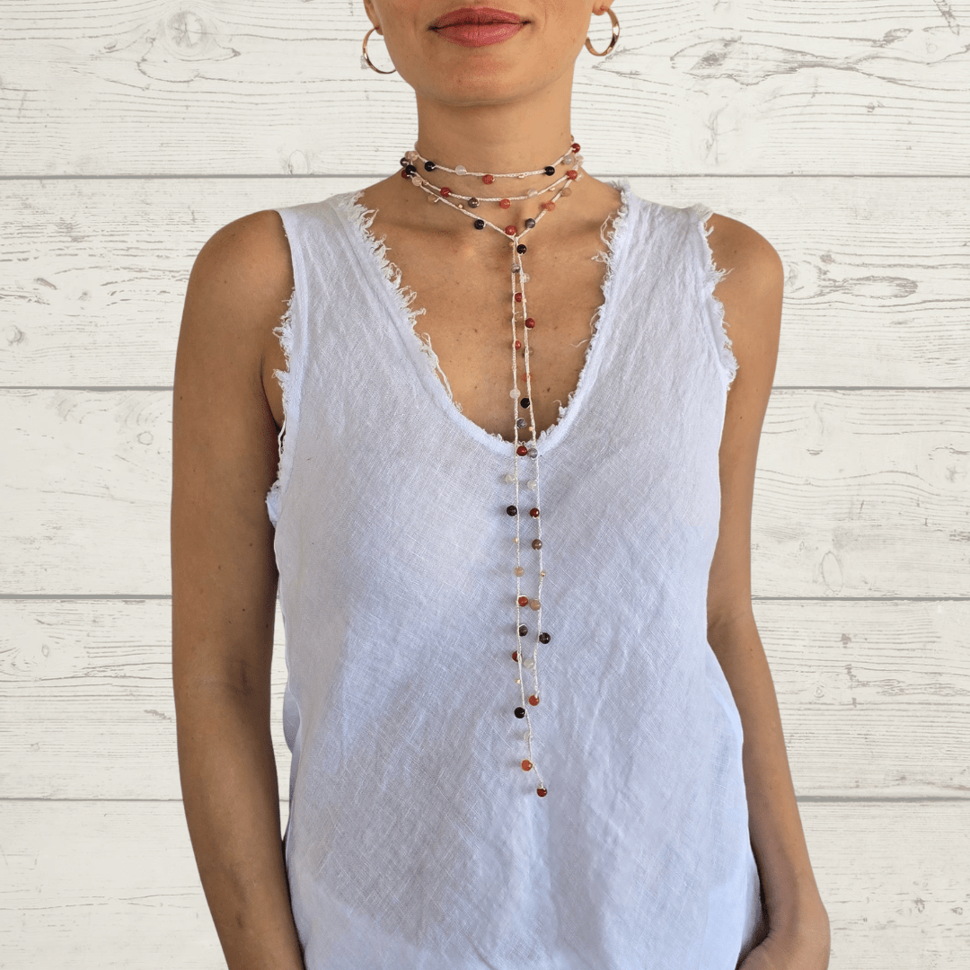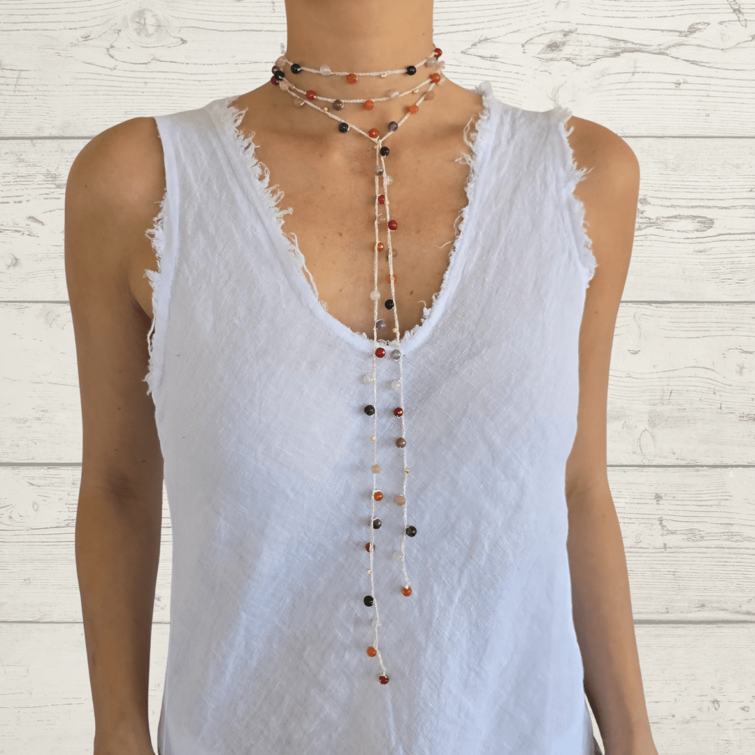 Collar largo tejido con algodón blanco y dorado, con mostacillas bañadas en oro y ágatas de colores