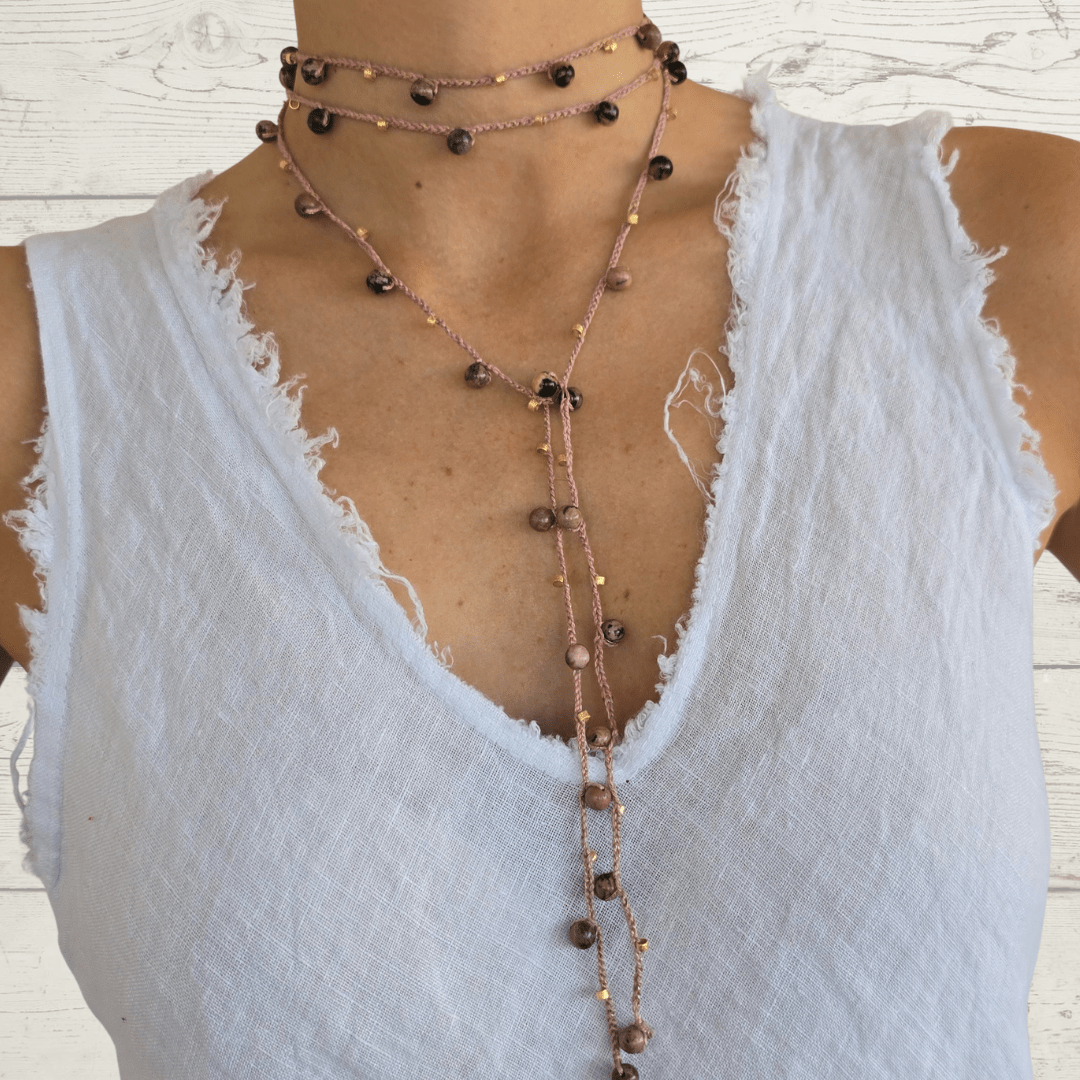 Collar largo tejido con algodón rosado y dorado, con mostacillas bañadas en oro y ágatas de colores