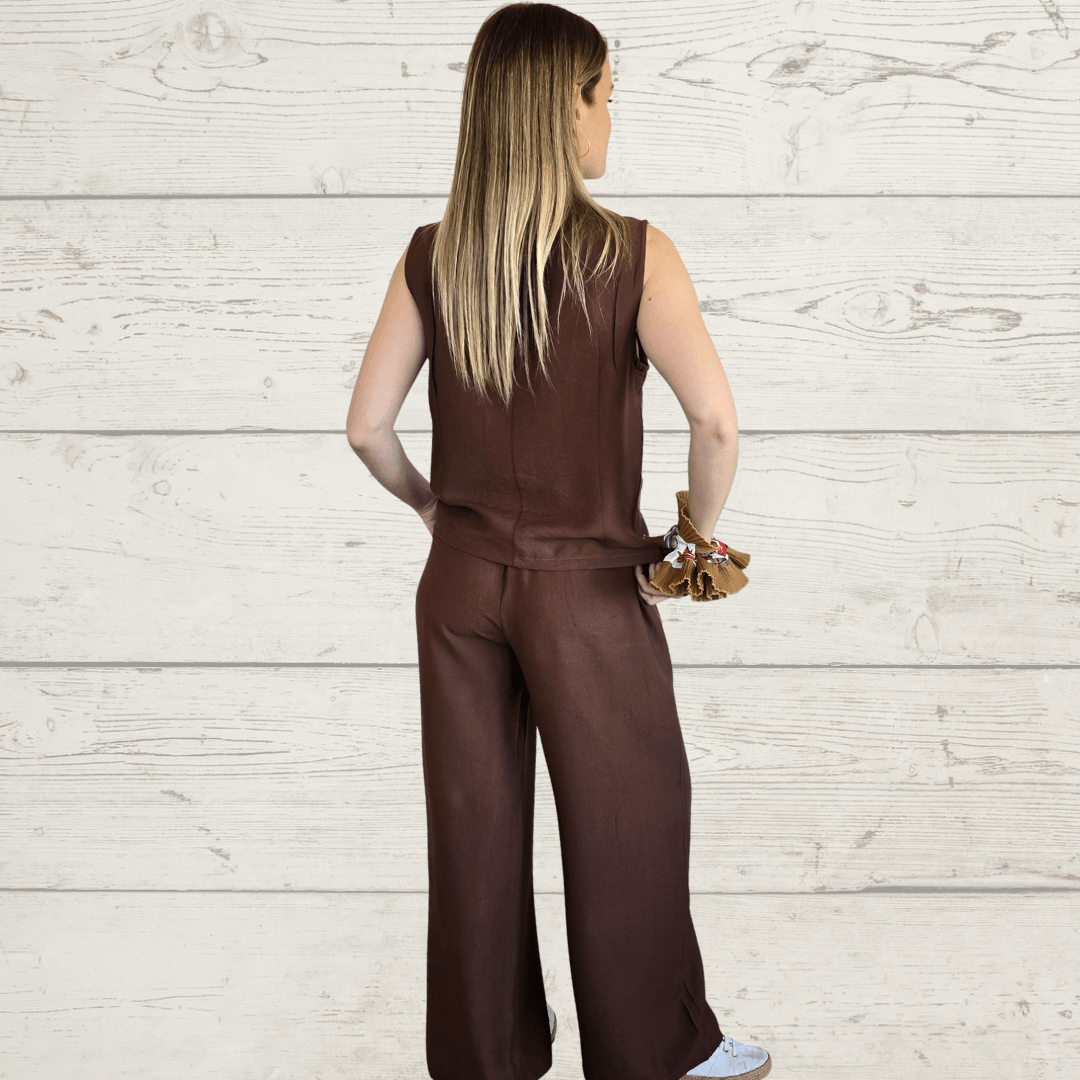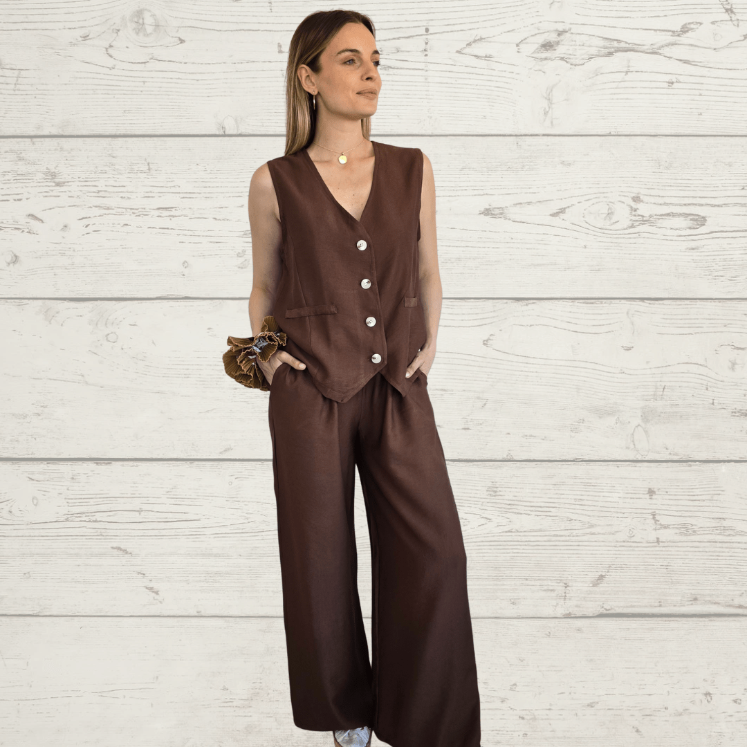 Conjunto de blusa gillete y pantalón con bolsillos a los lados, de poliviscosa, color chocolate