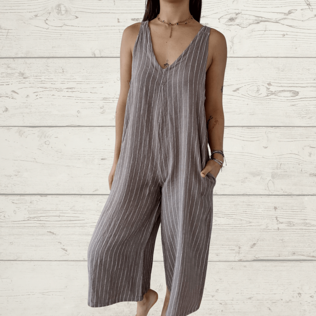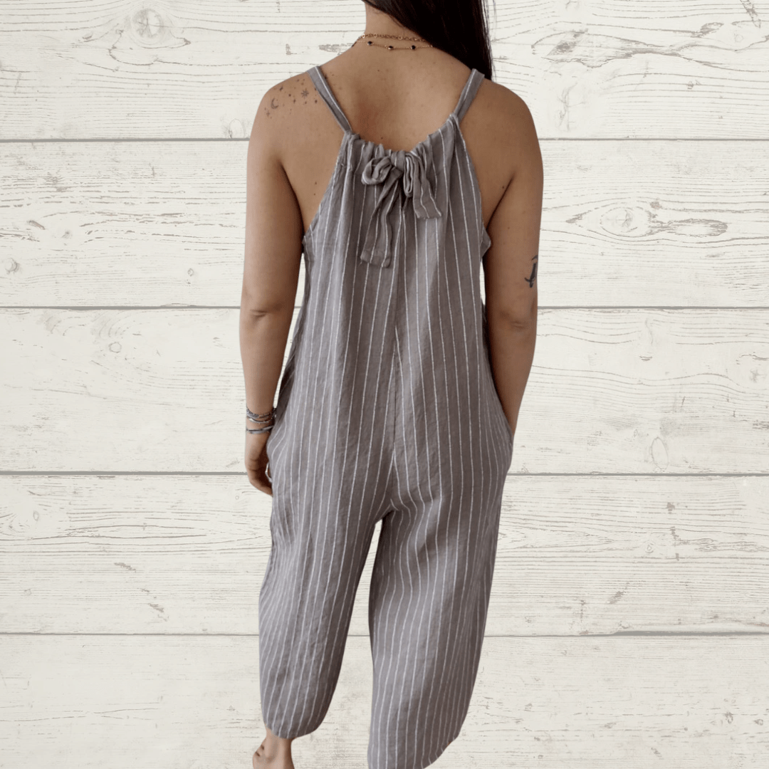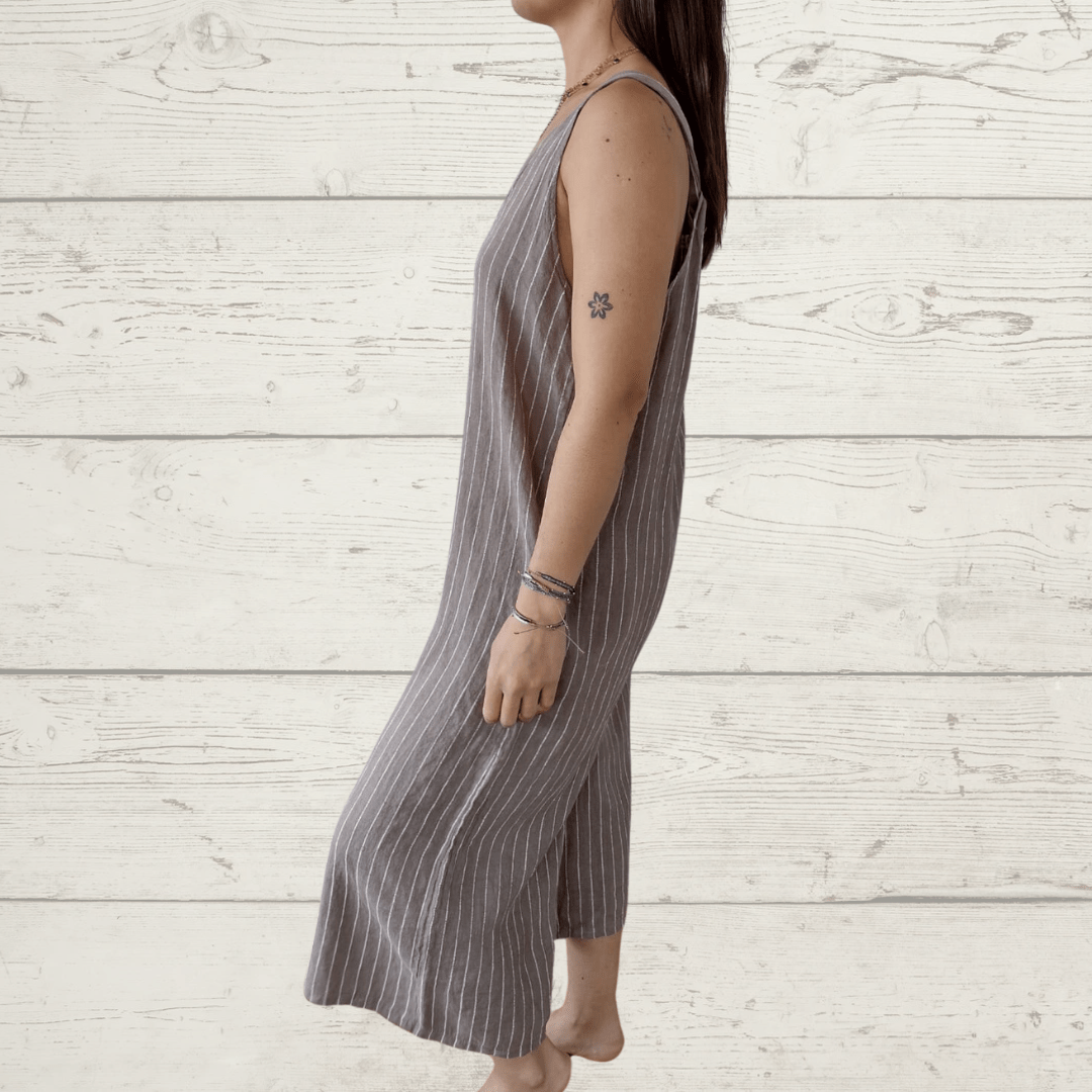 Enterito 100% Lino Italiano rallado, con bolsillos y lazo en la espalda, color chocolate