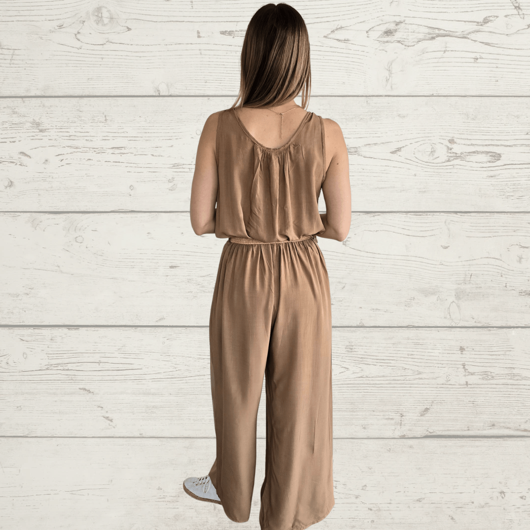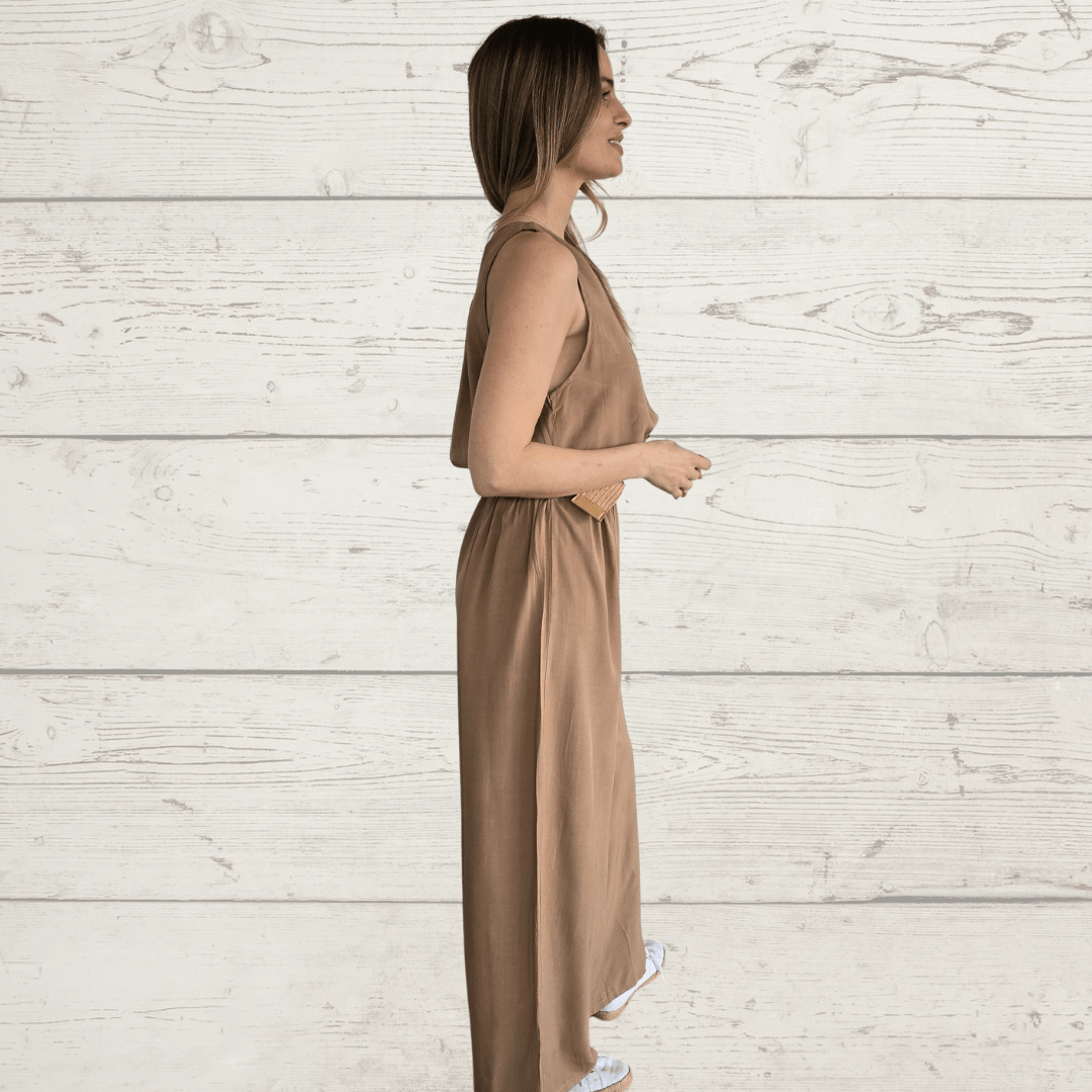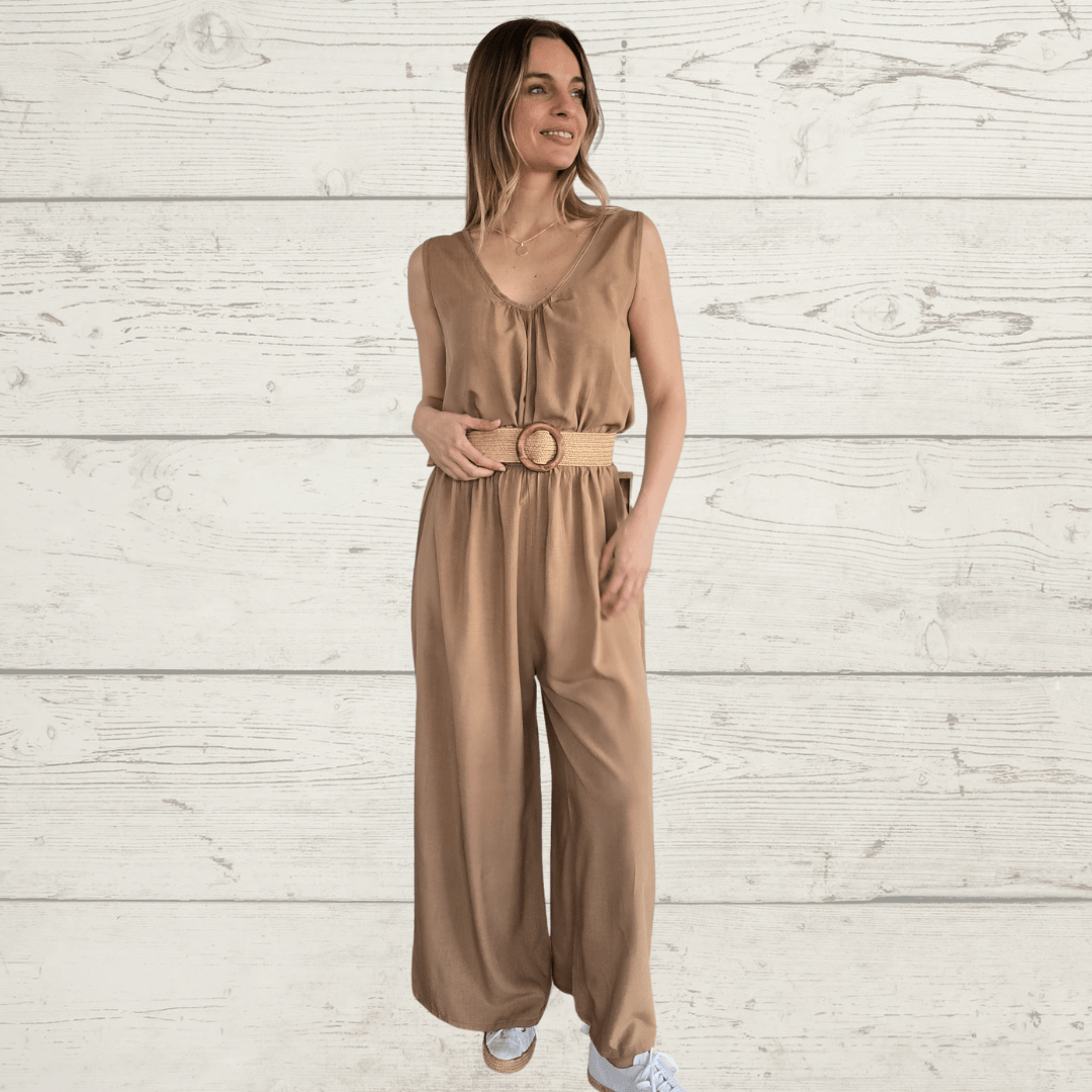 Enterito Italiano escote en V, con cinturón, sin mangas, de viscosa color camel