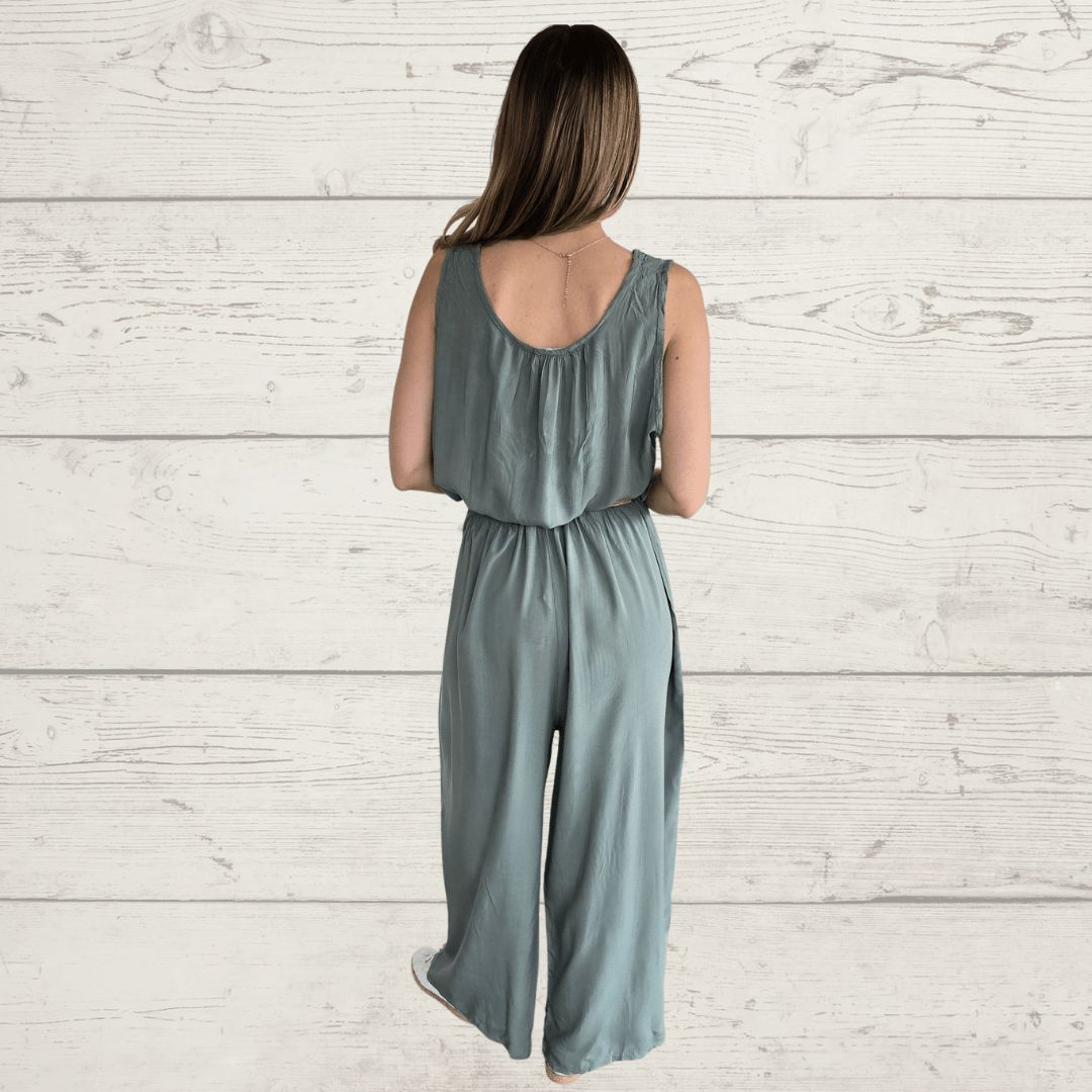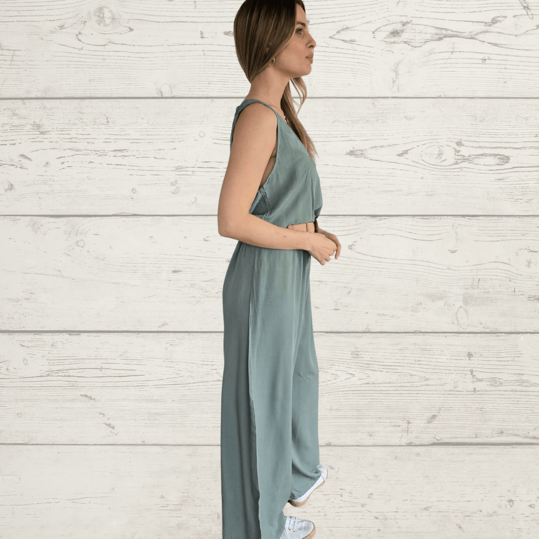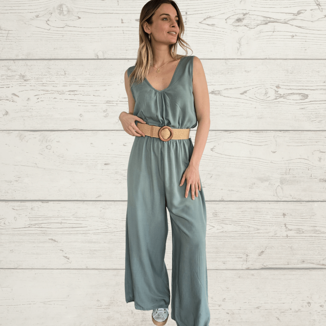 Enterito Italiano escote en V, con cinturón, sin mangas, de viscosa color verde
