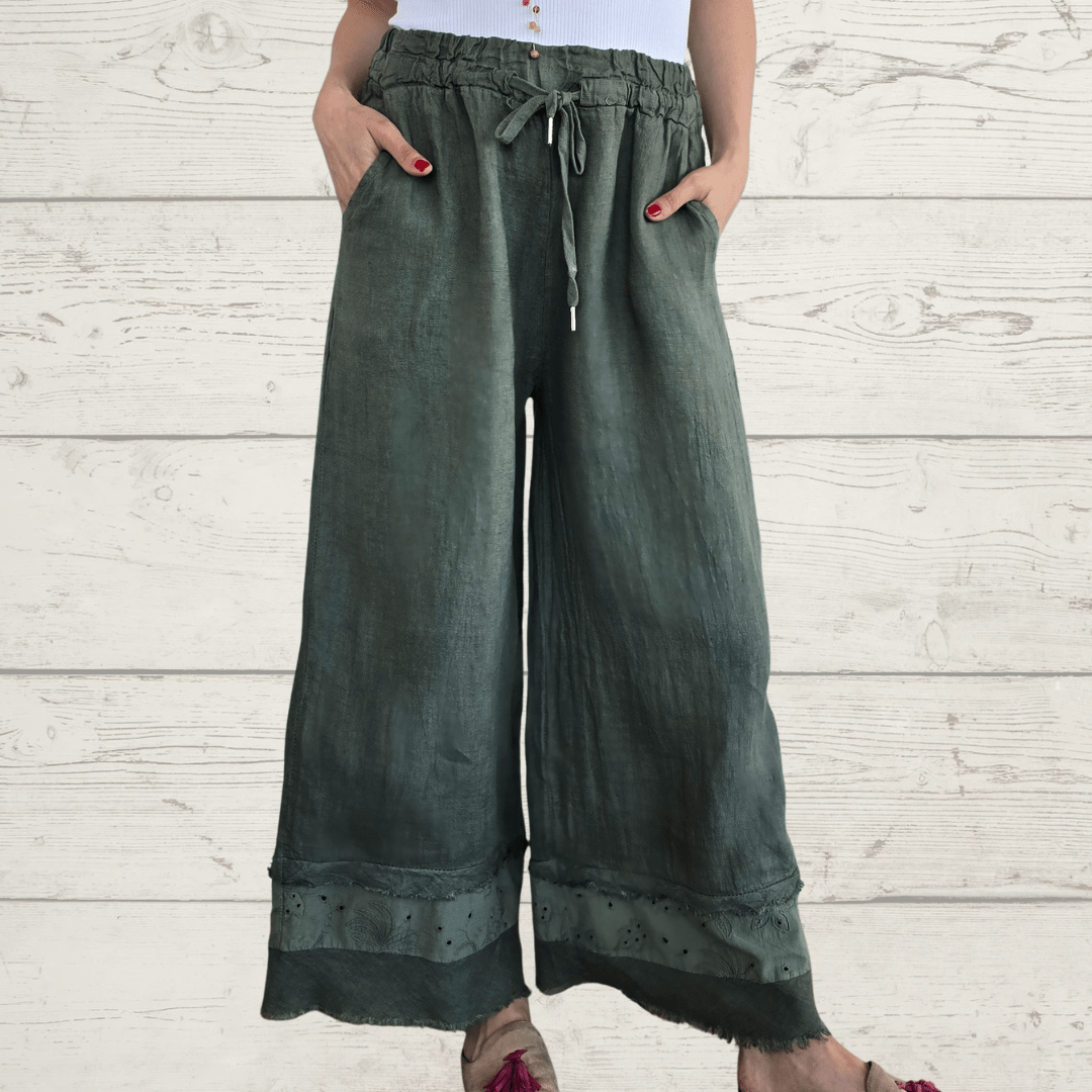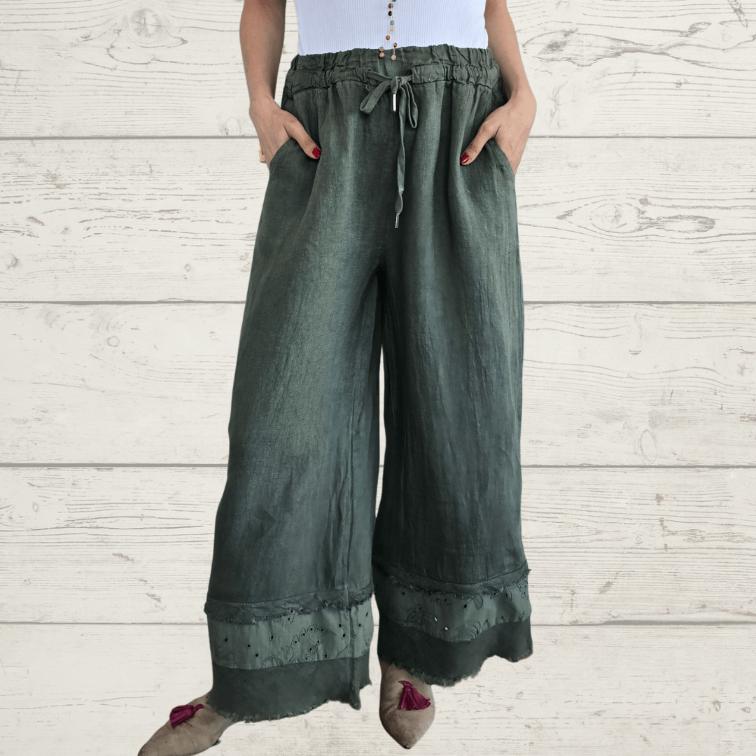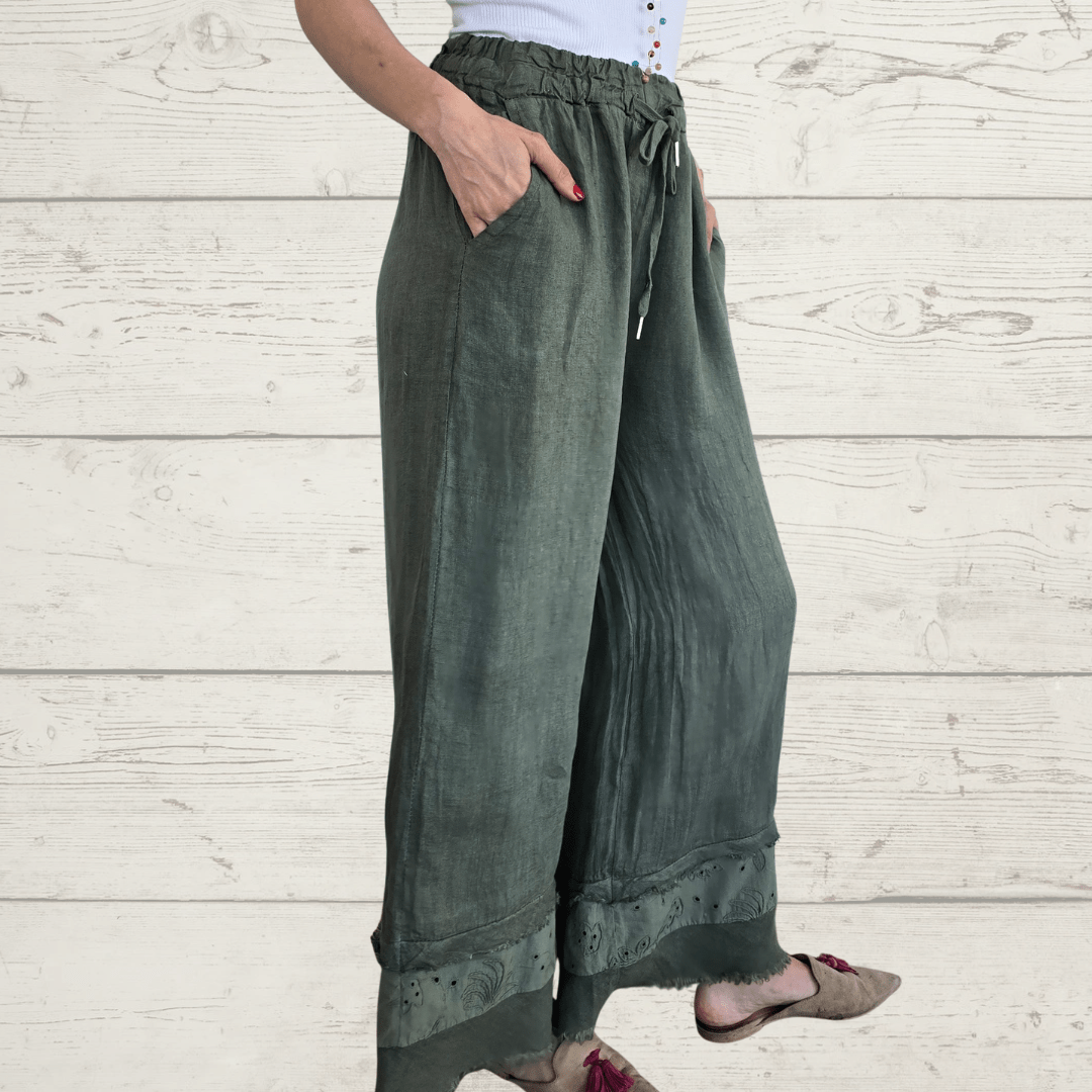 Pantalón 100% Lino Italiano, con bordado y desflecado en la basta, dos bolsillos, con elástico en la cintura, color verde