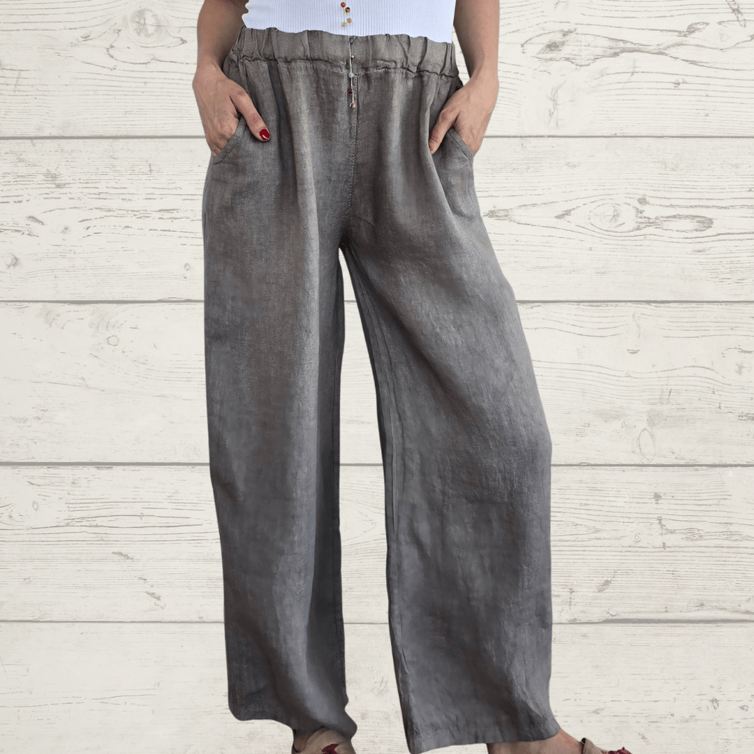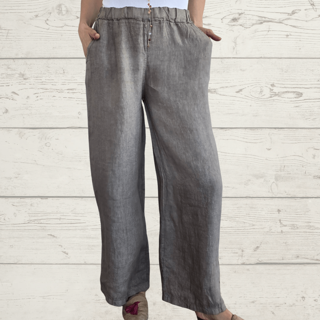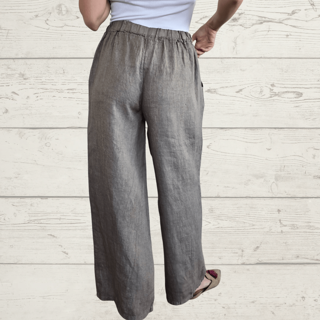 Pantalón 100% Lino Italiano, con dos bolsillos a los lados, con elástico en la cintura, color taupe