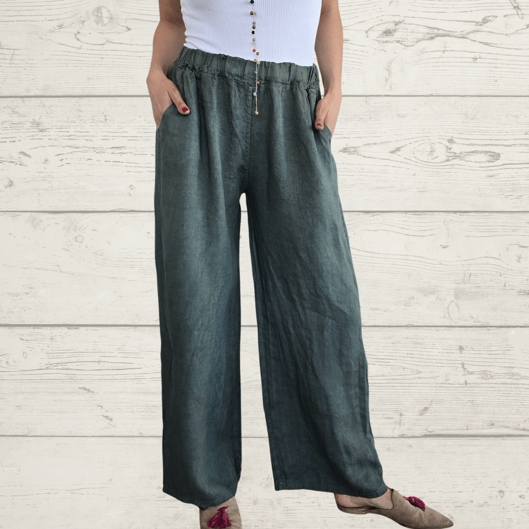 Pantalón 100% Lino Italiano, con dos bolsillos a los lados, con elástico en la cintura, color verde