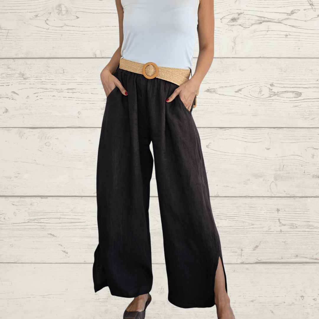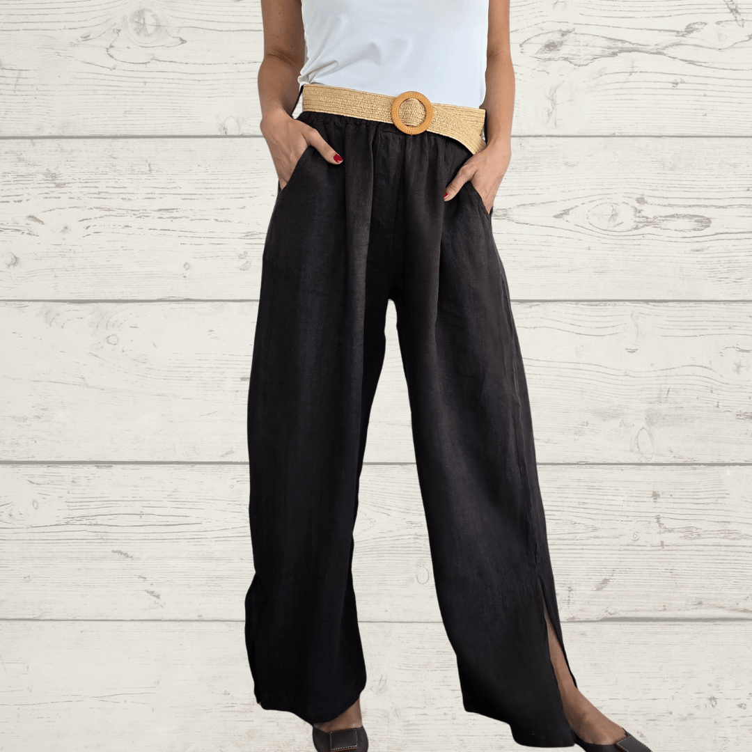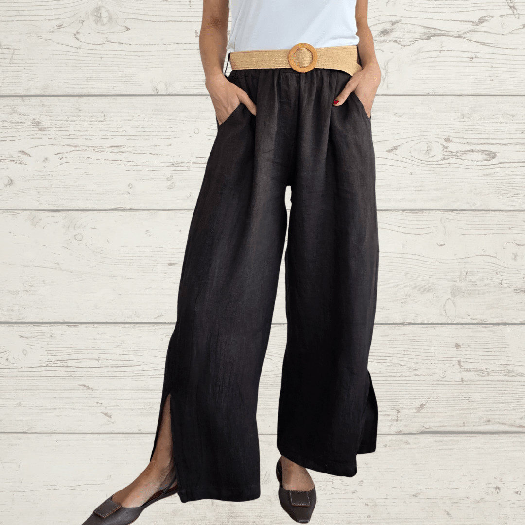 Pantalón 100% Lino Italiano, con cinturón, dos bolsillos y abierto a lo lados en la basta, con elástico en la cintura, color chocolate