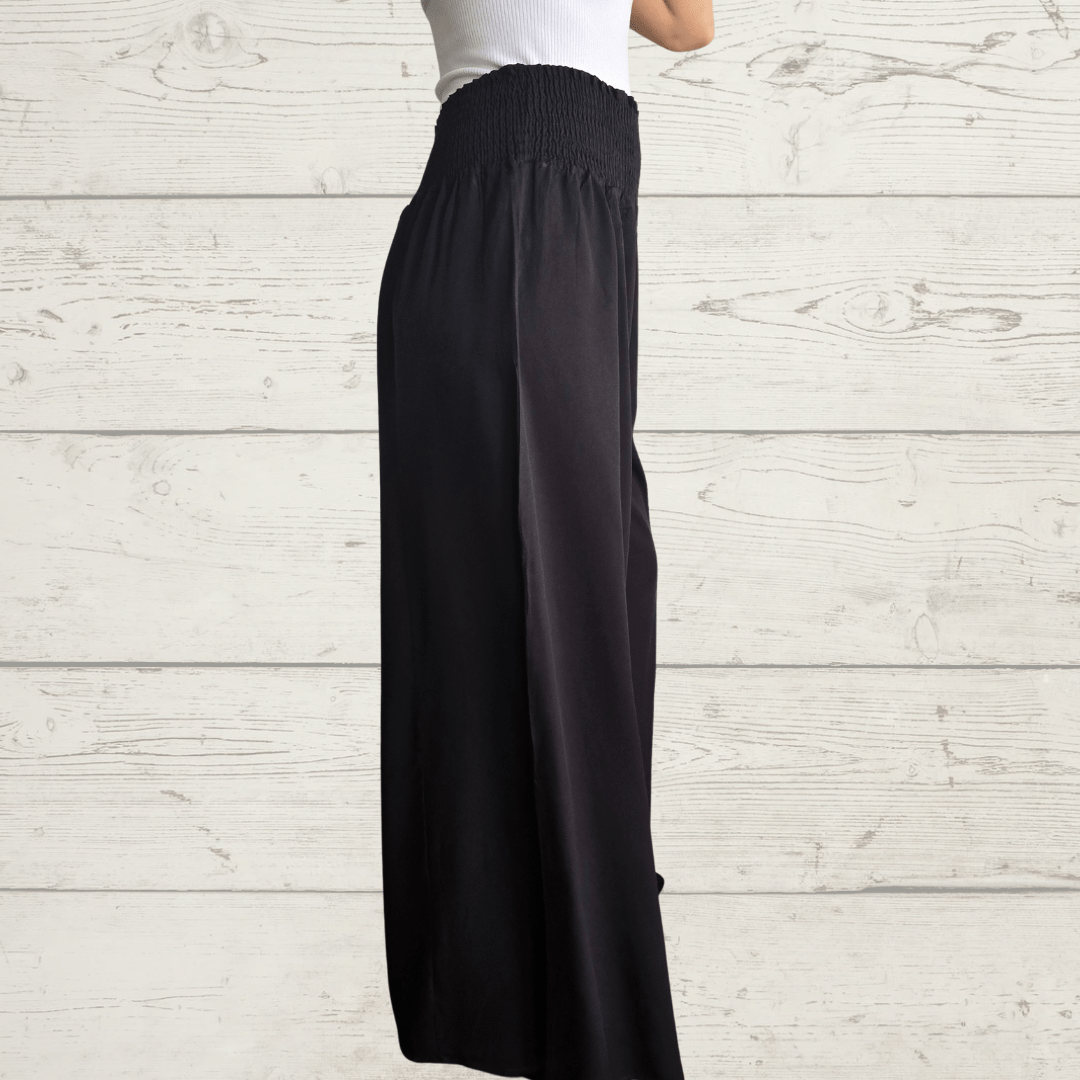 Pantalón ancho de viscosa, pretina elasticada, color negro