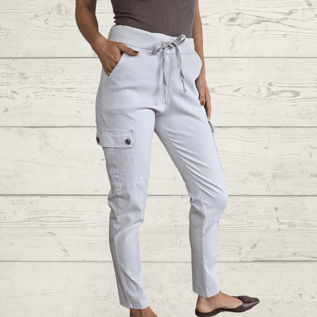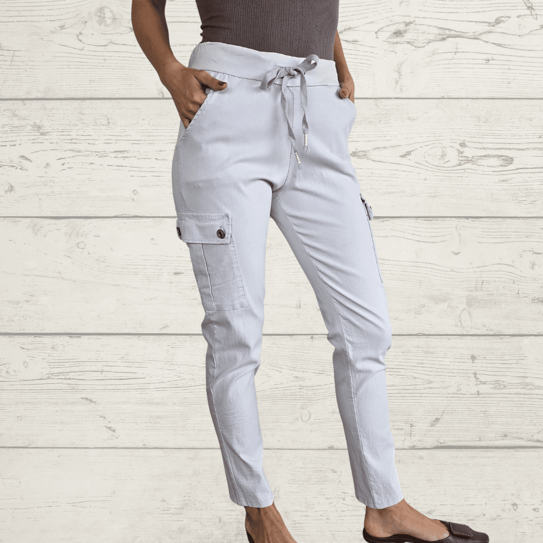 Pantalón Italiano cargo de algodón con Spandex, con bolsillos a los lados, color gris claro