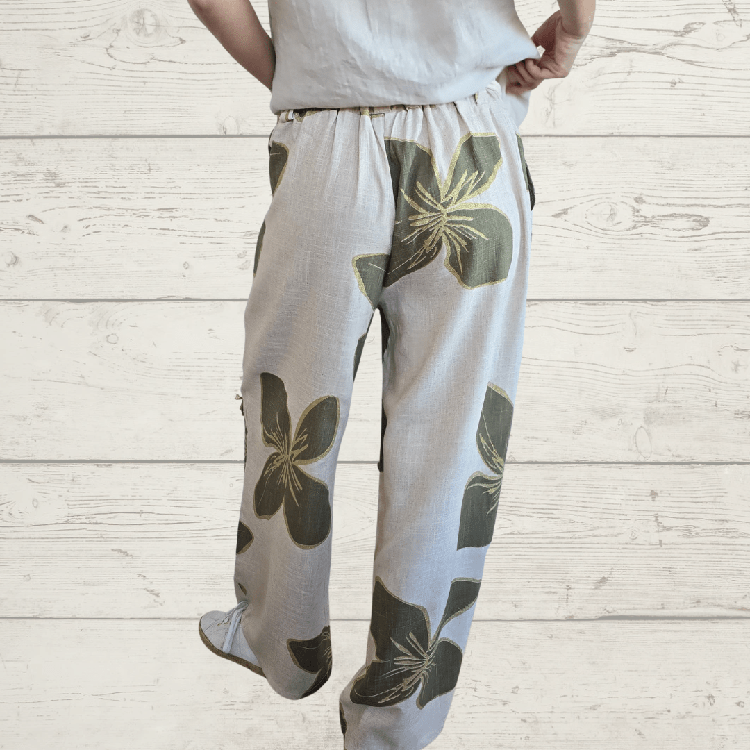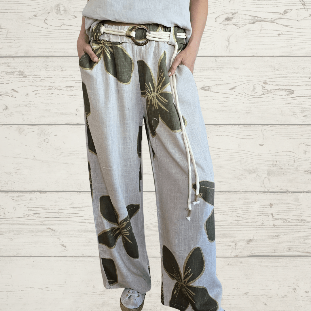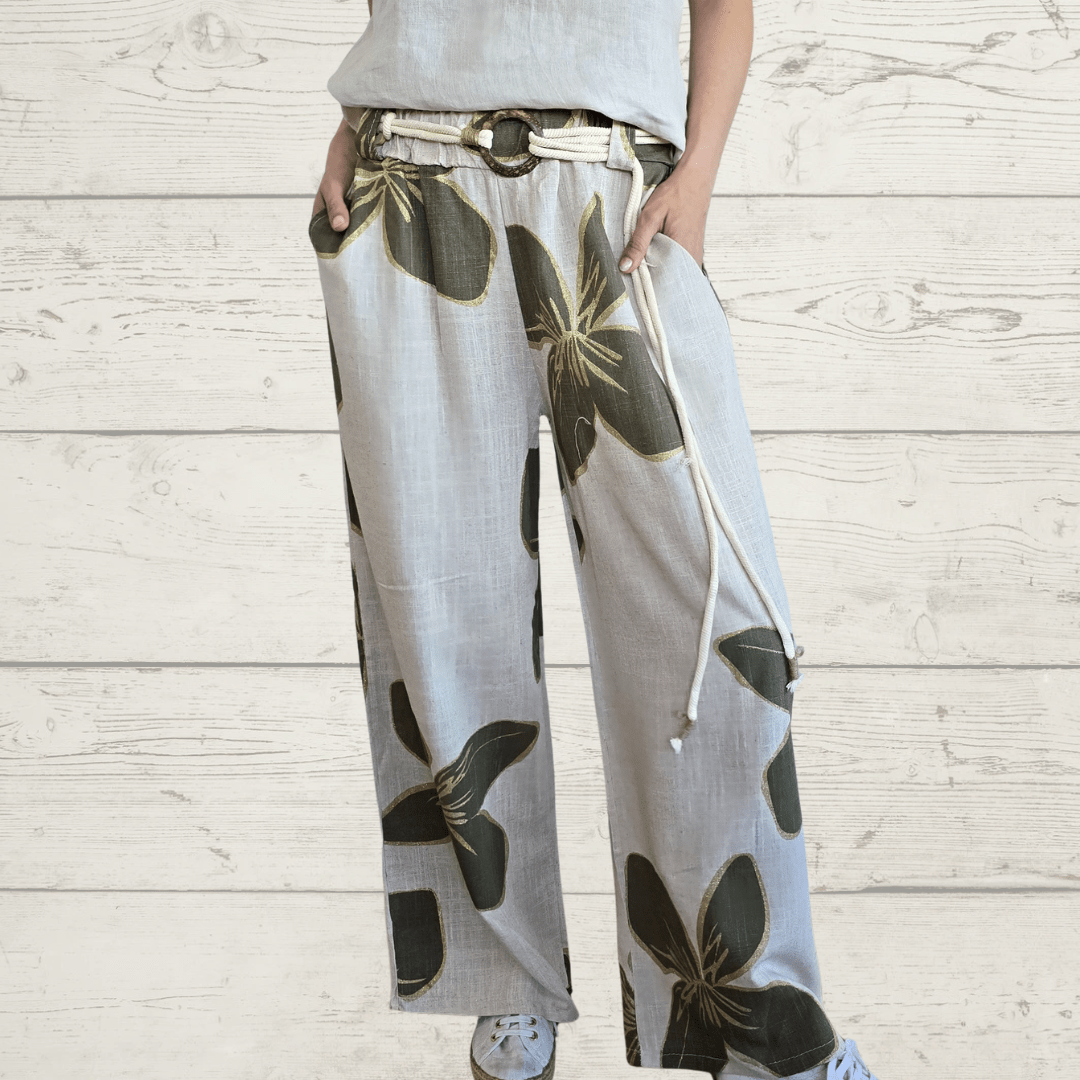 Pantalón italiano estampado, con cinturón tipo cordel, dos bolsillos delanteros, de lino con viscosa, pretina elástica, fondo beige con verde