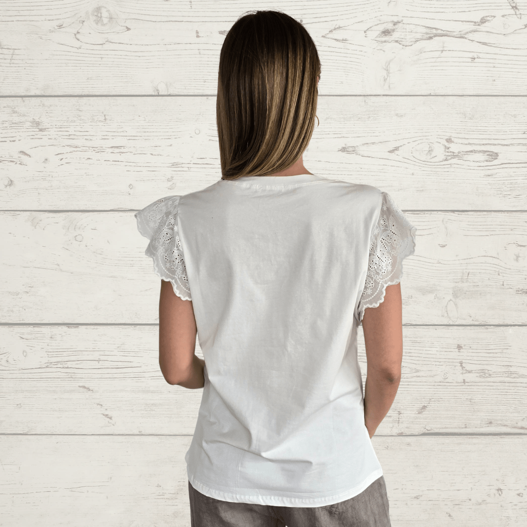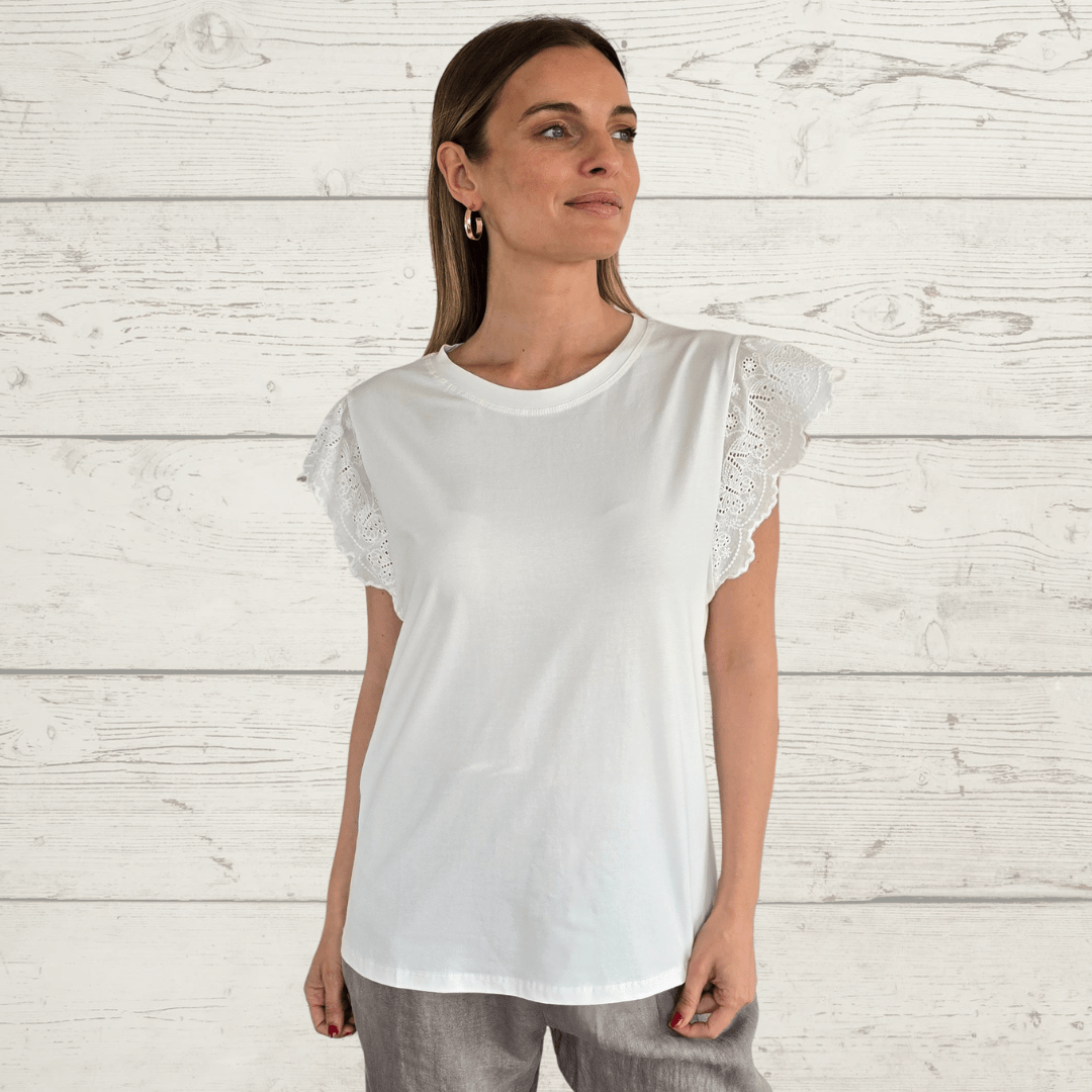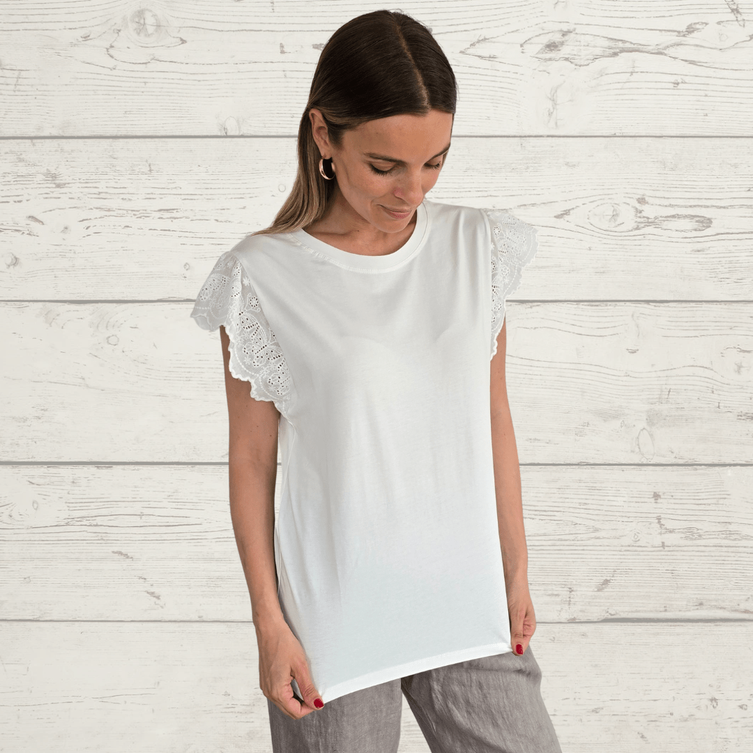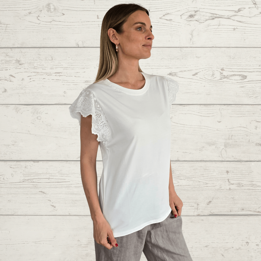 Polera de algodón con spandex con mangas bordadas, color blanco