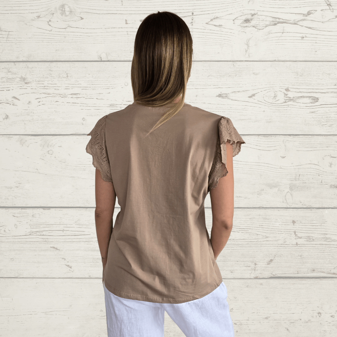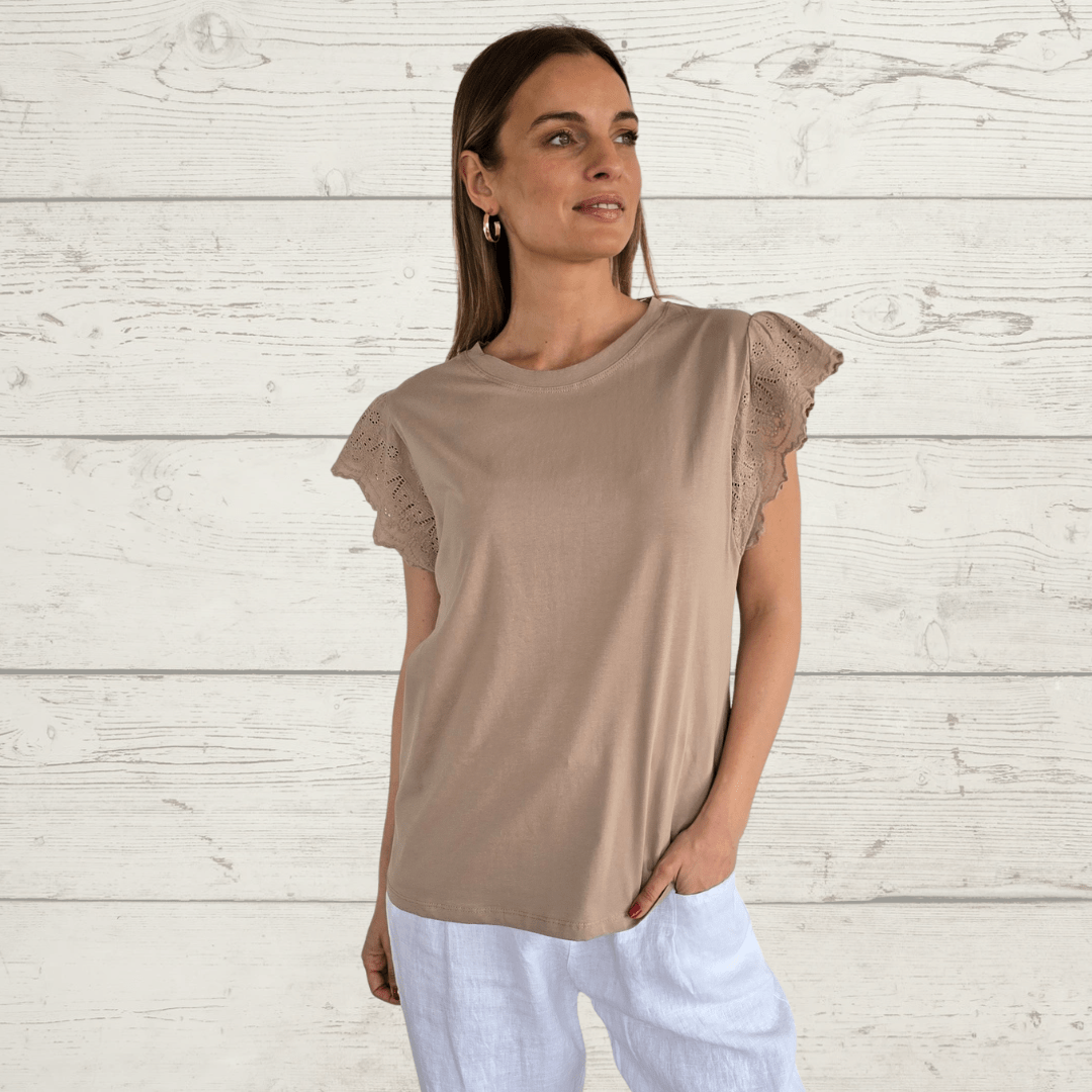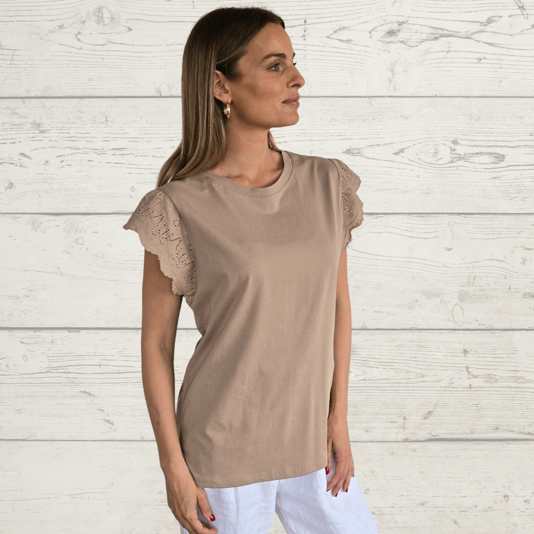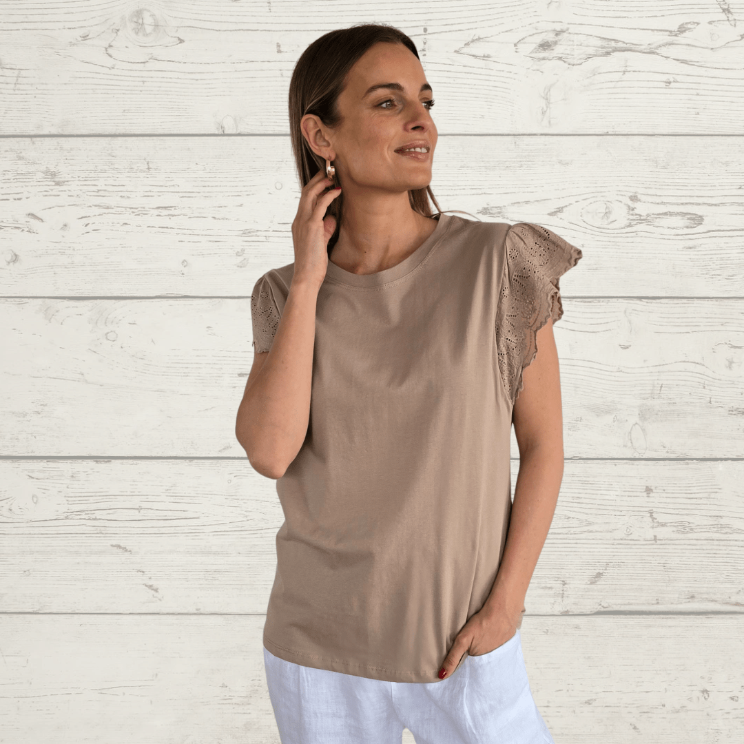 Polera de algodón con spandex con mangas bordadas, color tostado