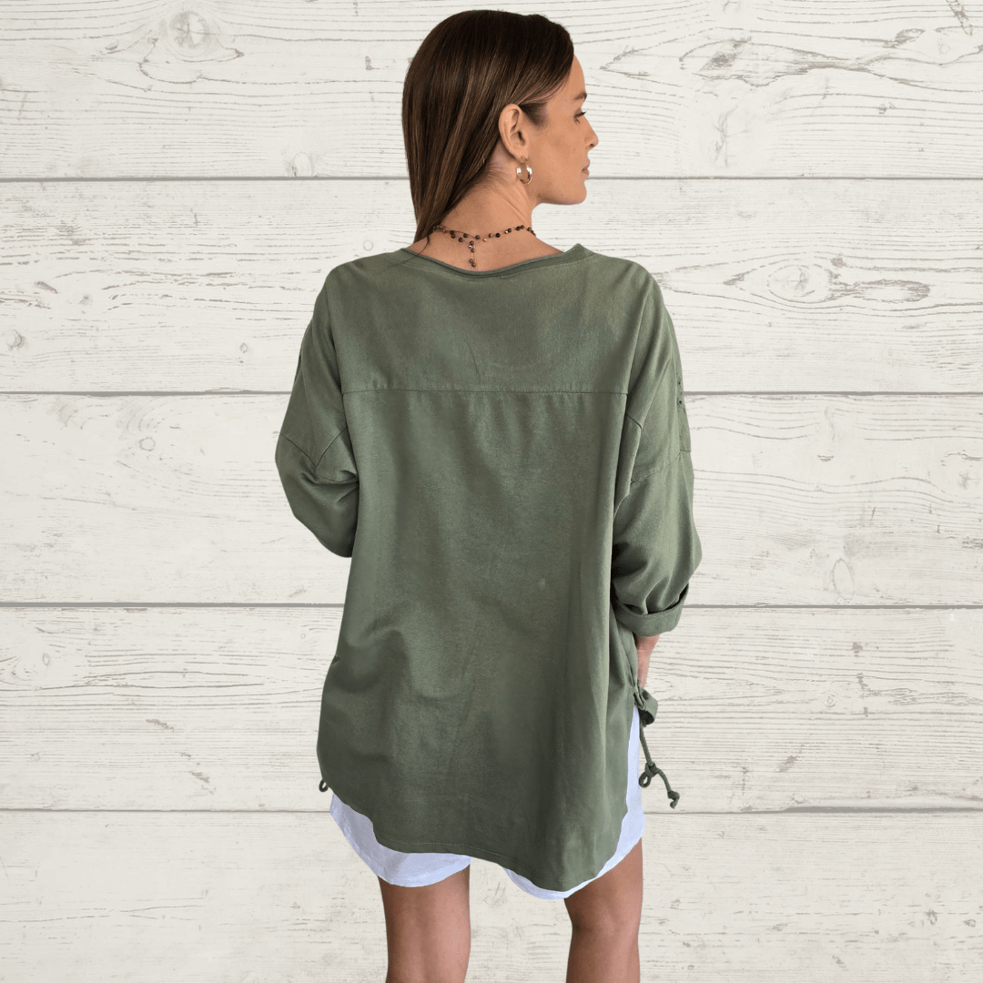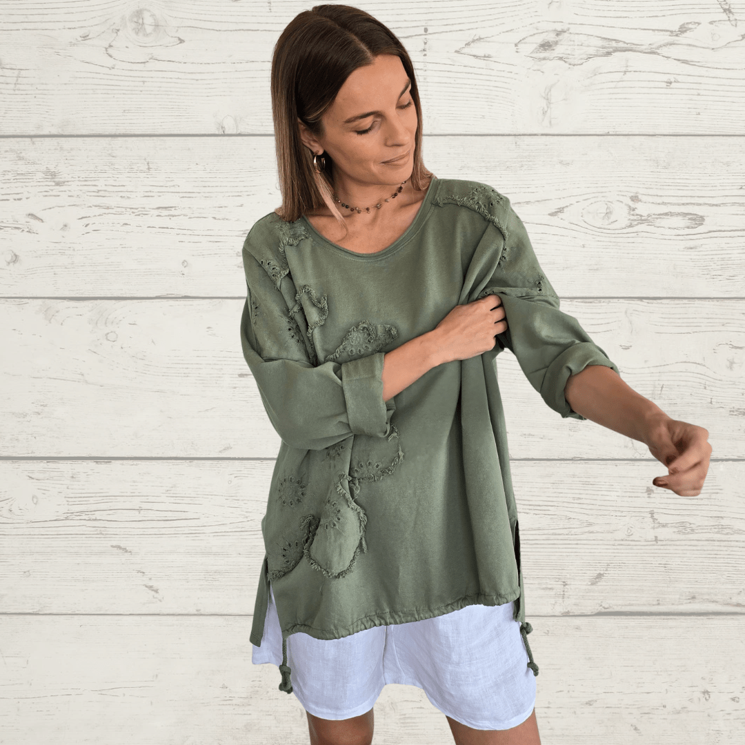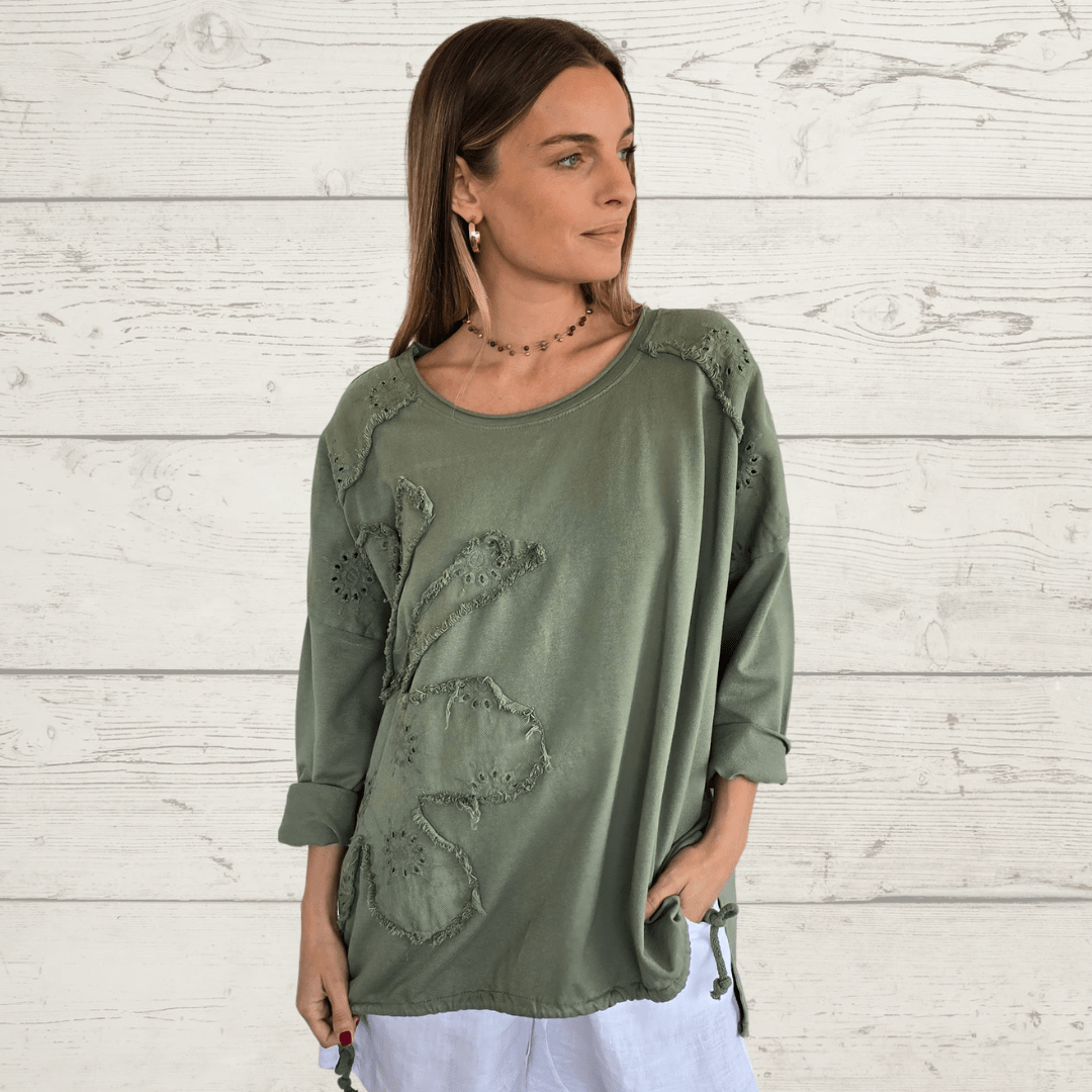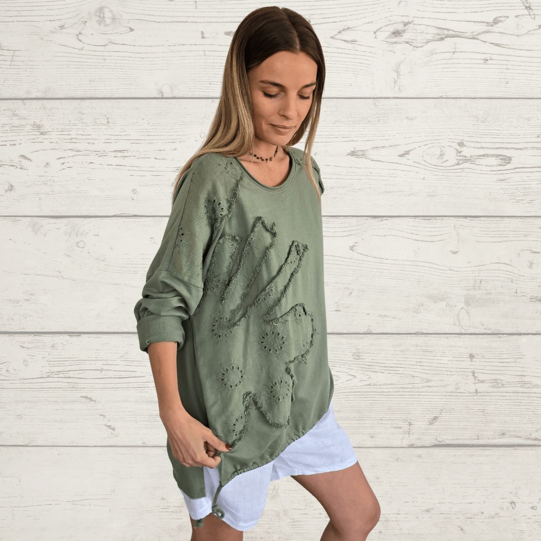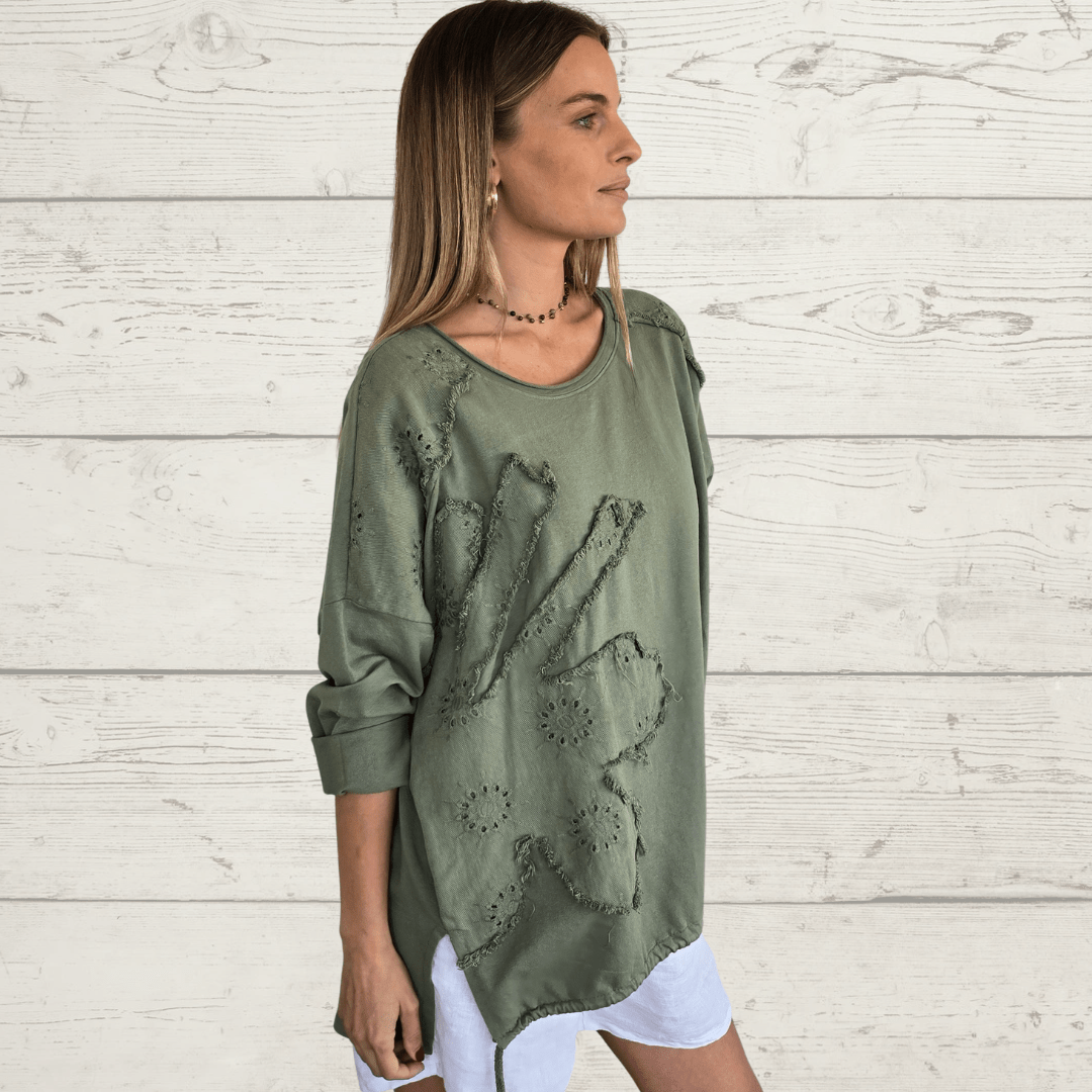 Polerón italiano, con flores bordadas, hombros broderie, 100% algodón, manga larga, color verde
