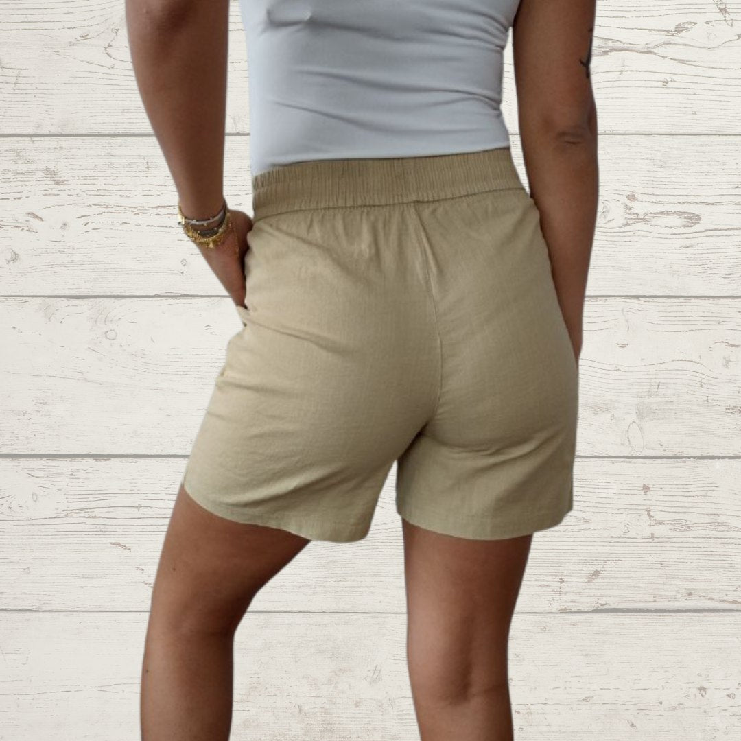 Short/Bermuda, gabardina/algodón, con dos bolsillos, pretina elasticada con cordel, color beige